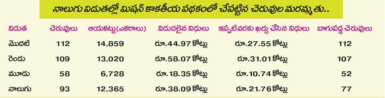 ఒకప్పుడు విశాలంగా ఉన్న చెరువులు.. కాలక్రమంలో నీటి గుంతల్లా మారిపోయాయి. ఉన్న ఆ కొద్దిపాటి వనరుల్లోకి వర్షం నీళ్లొచ్చినా నిల్వ ఉండలేని పరిస్థితి. భారీ వరదల వల్ల ‘గండ్లు’ పడితే ఒక్క రోజులోనే చెరువులు ఖాళీ అయిన సందర్భాలు కోకొల్లలు. ఈ పరిస్థితుల్లో అంతరించిపోతున్న జల వనరులను మళ్లీ పునరుద్ధరించాలన్న సదుద్దేశంతో చేపట్టిన మిషన్ కాకతీయ పథకంతో చెరువుల రూపురేఖలు సమూలంగా మారిపోయాయి. కాకతీయ రాజుల పాలనలో కళకళలాడిన గొలుసు కట్టు చెరువులు దశాబ్దాల కాలం తర్వాత సీఎం కేసీఆర్ పాలనలో మళ్లీ జలకళను సంతరించుకున్నాయి. నిర్మల్ జిల్లా వ్యాప్తంగా ఉన్న 372 చెరువులకు మిషన్ కాకతీయ పథకం కింద పూర్వ వైభవం కల్పించేందుకు తెలంగాణ ప్రభుత్వం రూ.159.50 కోట్లను మంజూరు చేసింది. ఈ మేరకు నాలుగు విడుతల్లో రూ.91.08 కోట్ల వరకు నిధులు వెచ్చించి 348 చెరువులను బాగు చేయించింది. ఈ నిధులతో తూములు మరమ్మతుకు నోచుకున్నాయి. చెరువుల అంతర్భాగంలో పేరుకుపోయిన పూడికను తొలగించారు. ఇటీవల జిల్లావ్యాప్తంగా కురిసిన వర్షాలకు యాభై వరకు చిన్ననీటి వనరులు దెబ్బతిన్నట్లు నీటి పారుదలశాఖ అధికారులు లెక్కలు తేల్చారు. అయితే ఇందులో మిషన్ కాకతీయ పథకం కింద మరమ్మతు చేపట్టిన చెరువు ఒక్కటీ లేకపోవడం గమనార్హం. ఒకటి, రెండు చెరువుల మట్టికట్టలు కొద్దిపాటిగా దెబ్బతిన్నాయని అధికారులు చెబుతున్నారు. మిషన్ కాకతీయ పథకం కింద చెరువులను పటిష్టపర్చడమే ఇందుకు కారణంగా వారు ఉదహరిస్తున్నారు. మిషన్ కాకతీయ పథకం లేకుంటే ప్రస్తుత వర్షాల కారణంగా జరిగే నష్టాన్ని ఊహించలేమని వారంటున్నారు.