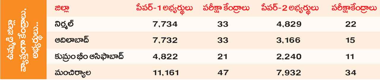 ఉమ్మడి ఆదిలాబాద్ జిల్లాలో రెండు పేపర్లకు కలిపి 49,616 మంది అభ్యర్థులు హాజరవుతున్నా రు. ఇందులో పేపర్1కు 31,449 మంది అభ్యర్థు లు హాజరుకాగా, అత్యధికంగా మంచిర్యాల్ జిల్లా నుంచి 11,161 మంది, అత్యల్పంగా కుమ్రం భీం ఆసిఫాబాద్ జిల్లా నుంచి 4822 మంది హాజరుకానున్నారు. పేపర్ 2 పరీక్ష కోసం మొత్తం 18,167 మంది అభ్యర్థులు దరఖాస్తు చేసుకోగా..అత్యధికంగా మంచిర్యాల జిల్లా నుంచి 7932 మంది హాజరుకానున్నారు. అత్యల్పంగా కుమ్రం భీం ఆసిఫాబాద్ జిల్లా నుంచి 2240 మది పరీక్షకు హాజరయ్యారు. వీరందరి కోసం ఉమ్మడి జిల్లా వ్యాప్తంగా 216 పరీక్షా కేంద్రాలు ఏర్పాటు చేశారు. మొదటి పేపర్కు మొత్తం 134 పరీక్షా కేంద్రాలు, రెండో పేపర్కు 82 పరీక్షా కేంద్రాలను ఏర్పాటు చేశారు.