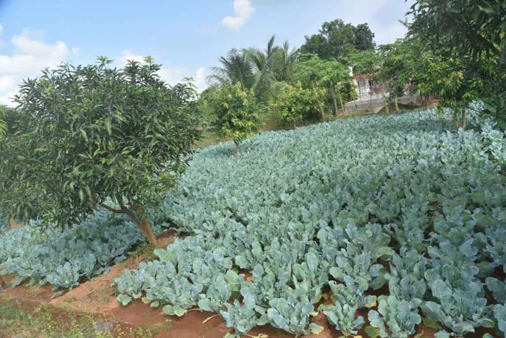 మామిడి తోట (60 చెట్లు), గోబీ, వంకాయ, చిక్కుడు, మిరప, టమాట, పాలకూర, మెంతి, కొత్తిమీర, బొప్పాయి. ఇవి కాక రెండు గుంటల్లో చేపల చెరువు ఉన్నది.