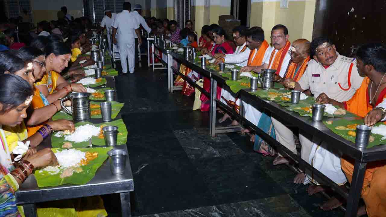చెంచు భక్తులతో కలిసి అన్నప్రసాదాన్ని స్వీకరిస్తున్న దృశ్యం