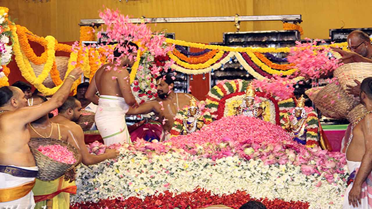 నెల్లూరు జిల్లా : శ్రీవేంకటేశ్వర స్వామి వైభవోత్సవాలు ఘనంగా జరుగుతున్నాయి. వైభవోత్సవాల్లో భాగంగా ఐదో రోజైన శనివారం ఉదయం నిర్వహించిన పుష్పయాగం సప్తవర్ణ శోభితంగా నిలిచింది. ఈ వేడుకకు వేల సంఖ్యలో భక్తులు తరలివచ్చారు. స్థానిక ఏసీ సుబ్బారెడ్డి స్టేడియంలో వైభవోత్సవాలు టీటీడీ నిర్వహిస్తున్నది. సుగంధాల్ని వెదజల్లే రంగు రంగుల పుష్పాలు, పత్రాలతో ఈ పుష్పారాధన వేడుకగా జరిగింది. పుష్పార్చన జరుగుతుండగా శ్రీదేవి, భూదేవి సమేత శ్రీమలయప్పస్వామివారి దివ్యమనోహర రూపాన్ని వర్ణించడానికి మాటలు చాలవు. శ్రీవారి నమూనా ఆలయంలో ఉదయం 6 గంటలకు సుప్రభాతం, 6.30 నుంచి 7.30 గంటల వరకు తోమాలసేవ, కొలువు, 7.30 నుంచి 8.15 గంటల వరకు అర్చన, 8.15 నుంచి 8.30 గంటల వరకు నివేదన, శాత్తుమొర నిర్వహించారు.