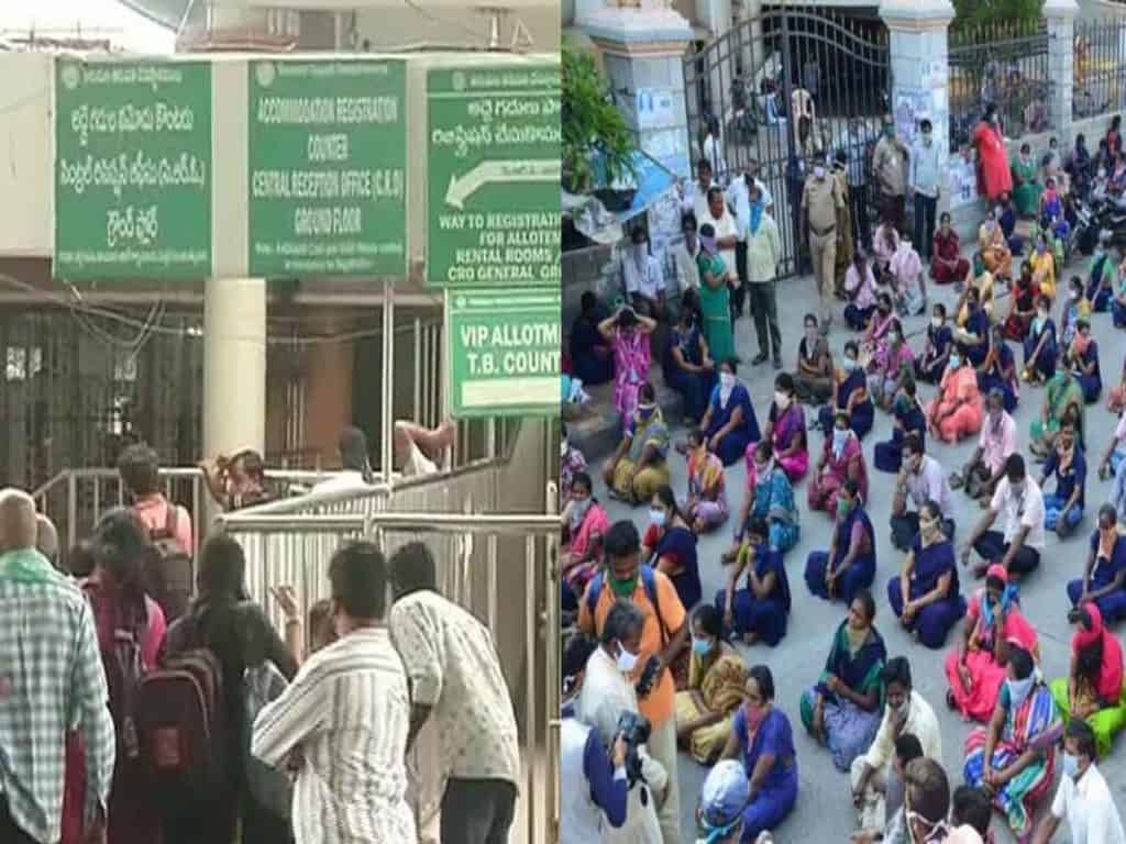 (TTD Contract Employees) తిరుమల : తిరుమల తిరుపతి దేవస్థానంలో పారిశుద్ధ్య ఒప్పంద కార్మికులు తమ ఆందోళనను కొనసాగిస్తున్నారు. తమను టీటీడీ కార్పొరేషన్లో కలుపాలంటూ వారం రోజులుగా విధులు బహిష్కరించి ఎఫ్ఎంఎస్ సర్వీసెస్ ఉద్యోగులు ఆందోళన చేస్తున్నారు. దీంతో తిరుమల కొండపై భక్తులు అనేక ఇక్కట్లకు గురవుతున్నారు. చెత్త పోరుకుపోవడంతో దుర్గంధంగా తయారవుతున్నది.