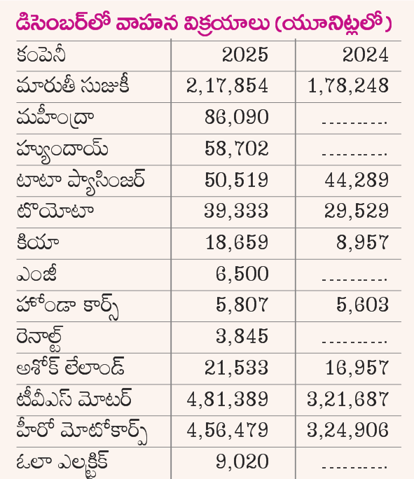 ఇక నిరుడు మారుతీ సుజుకీ, మహీంద్రా అండ్ మహీంద్రా, టాటా మోటర్స్ ప్యాసింజర్ వెహికిల్స్ టొయోటా కిర్లోస్కర్ మోటర్, స్కోడా ఆటో ఇండియా వంటి సంస్థల వార్షిక అమ్మకాలు బాగా పెరిగాయి. ముఖ్యంగా గత ఏడాది సేల్స్లో భారతీయ ఆటో సంస్థలు మహీంద్రా, టాటాలు దుమ్మురేపాయి. దీంతో దక్షిణ కొరియా సంస్థ హ్యుందాయ్ నాల్గో స్థానానికి దిగజారింది. మారుతీ సుజుకీ ఎప్పట్లాగే టాప్లో ఉన్నది. 2025లో ఎస్యూవీలకు గిరాకీ బాగా ఉన్నట్టు గురువారం ఇండస్ట్రీ తెలిపింది. ఇక జీఎస్టీ జోష్తో చిన్న కార్ల సెగ్మెంట్లో మారుతీ పరుగులు పెట్టింది.