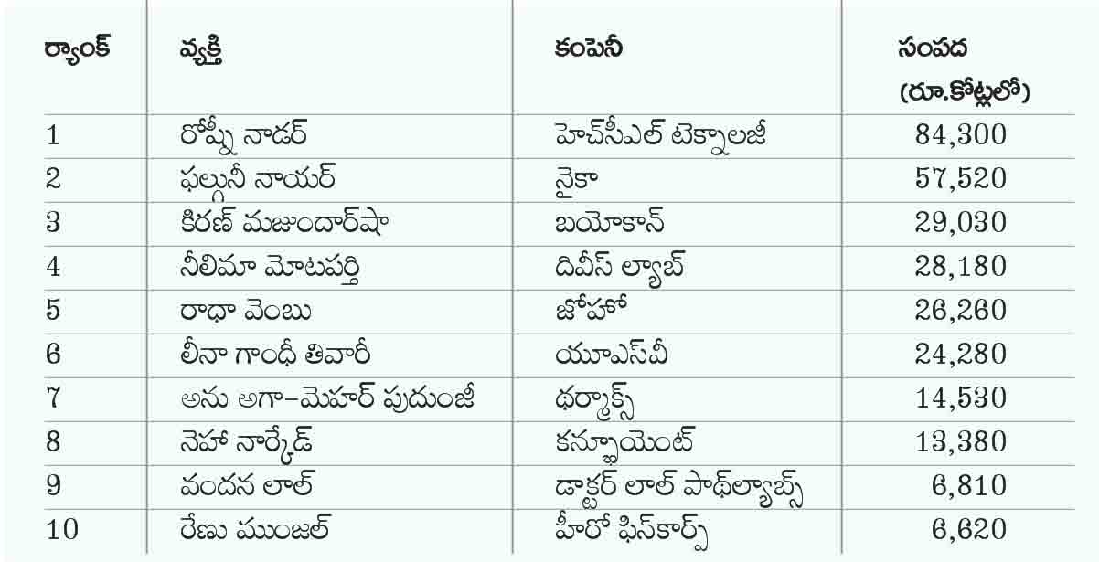 59 ఏండ్ల వయస్సు కలిగిన నాయర్..గడిచిన ఆర్థిక సంవత్సరంలో ఆమె సంపద 963 శాతం ఎగబాకింది. బయోకాన్ చీఫ్ కిరణ్ మజుందార్ షా సంపద మాత్రం 21 శాతం తగ్గినప్పటికీ ఈ జాబితాలో మూడో స్థానంలో నిలిచారు. రూ.29,030 కోట్ల నికర విలువ కలిగివున్నారు. భారత్లో పుట్టి లేదా ఇక్కడ పెరిగిన 100 మంది మహిళా సంపన్న వర్గాలతో ఈ జాబితాను రూపొందించారు. ఈ వందమంది మహిళల నికర సంపద 53 శాతం ఎగబాకి రూ.4.16 లక్షల కోట్లకు చేరుకున్నది. 2020లో ఇది రూ.2.72 లక్షల కోట్లుగా ఉన్నది. దేశ జీడీపీలో వీరి సంపద 2 శాతంగా ఉన్నది. రూ.300 కోట్లకు పైగా సంపద ఉన్నవారితో ఈ జాబితాను రూపొందించింది.
