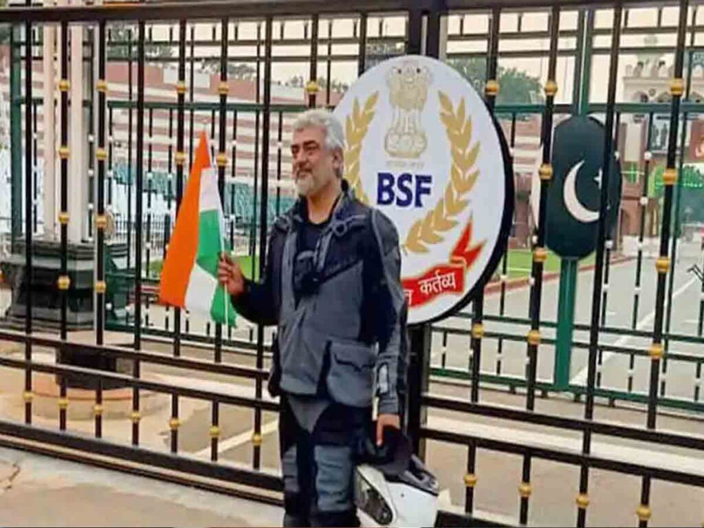 అజిత్ బైక్ రైడింగ్ని చాలా ఇష్టపడతాడు అనే విషయం మనకు తెలిసిందే. బైక్ పై కొన్ని వందలు.. వేల కిలో మీటర్ల ప్రయాణంను ఆయన చేస్తూ ఉంటాడు. తాజాగా అజిత్ వాఘా సరిహద్దు వద్ద ఉండే దగ్గర వద్ద నిల్చుని మూడు రంగుల జెండా పట్టుకుని ఫొటోలకు ఫోజు ఇచ్చాడు. ప్రస్తుతం అజిత్ ఫొటో సోషల్ మీడియాలో చక్కర్లు కొడుతుంది.
