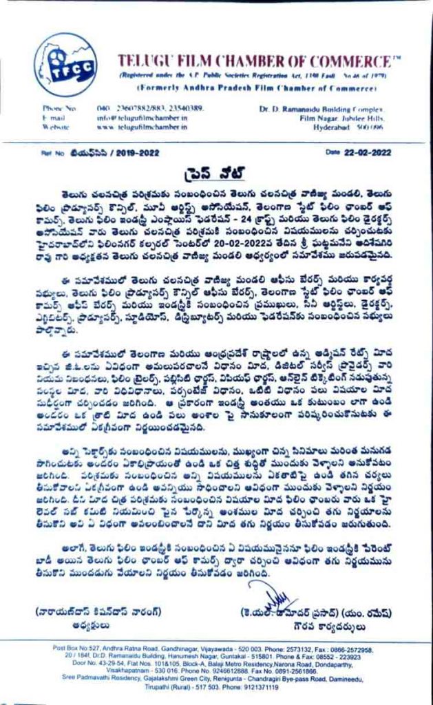 ఏపీ, తెలంగాణలోని అడ్మిషన్ రేట్స్పై ఇచ్చిన జీవోలను ఏవిధంగా అమలు చేయాలనే విధానంపై ఆదివారం జరిగిన సమావేశంలో చర్చించినట్లు తెలంగాణ ఫిలిం ఛాంబర్ ఆఫ్ కామర్స్ ప్రెస్నోట్లో పేర్కొంది. దీంతో పాటు డిజిటల్ సర్వీస్ ప్రొవైడర్స్ నియమ నిబంధనలు, ఫిలిం ట్రైలర్స్, పబ్లిసిటీ ఛార్జీలు, వీవీఎఫ్ ఛార్జీలు, ఆన్లైన్ టిక్కెటింగ్ సంస్థల విధివిధానాలు, ఓటీటీ వంటి పలు అంశాలపై ఈ సమావేశంలో చర్చించామని తెలిపింది. చిన్న సినిమాలు మరింత మనుగడ సాధించేందుకు అందరూ ఏకాభిప్రాయంతో ఉండి చిత్తశుద్ధితో ముందుకు వెళ్తామని ప్రెస్నోట్లో పేర్కొంది. అలాగే సినీ పరిశ్రమకు సంబంధించిన అన్ని విషయాలను ఏకతాటిపై ఉండి సాధించుకోవాలని నిర్ణయించినట్లు చెప్పింది. ఇందుకోసం ఫిలిం ఛాంబర్ ఆధ్వర్యంలో హైలెవల్ సబ్ కమిటీ నిర్ణయించి తగు నిర్ణయాలు తీసుకుంటామని పేర్కొంది. ఈ మేరకు ఫిలిం ఛాంబర్ ఆఫ్ కామర్స్ అధ్యక్షుడు నారాయణ దాస్ నారంగ్, గౌరవ కార్యదర్శి దామోదర ప్రసాద్ ప్రెస్నోట్ విడుదల చేశారు.