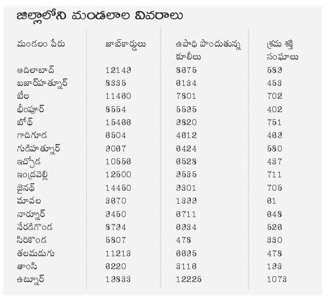 ఆదిలాబాద్ జిల్లాలో మొత్తం 467 గ్రామ పంచాయతీలు ఉన్నాయి. అన్ని గ్రామాల్లో ఉపాధి హామీ పనులు కొనసాగుతున్నాయి. జిల్లా వ్యాప్తంగా లక్ష 74 వేల 28 వేల జాబ్కార్డులు ఉండగా లక్ష 15 వేల 983 మంది కూలీలు ఉపాధి హామీ పనులు చేస్తున్నారు. 9108 శ్రమశక్తి సంఘాలు ఉన్నాయి. ప్రస్తుతం పంట కాల్వలు శుభ్రం చేయడం, చెరువుల్లో పూడికతీత తొలగించడం, రాళ్లు ఏరడం, హరితహారంలో నాటిన మొక్కల సంరక్షణ, వ్యవసాయ క్షేత్రాలను చదును చేయడం, అటవీ ప్రాం తాల్లో ట్రెంచ్ల ఏర్పాటు చేస్తున్నారు. వచ్చిన వా రి వివరాలు గతంలో మస్టర్లలో వారి సంతకాలు తీసుకొని నమోదు చేసే వారు. రాని వారి పేర్లు సైతం అందులో పొందుపర్చడం వంటివి కొన్ని చోట్ల చేయడంతో పనులు చేసిన అసలు కూలీలకు అన్యాయం జరిగేది. ఇలాంటి అక్రమాలు తనిఖీల్లో బయటపడుతుండడంతో దానికి పూర్తిస్థాయిలో అడ్డుకట్ట వేసేందుకు ప్రభుత్వాలు ప్రత్యేక చర్యలు తీసుకుంది.