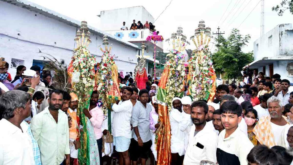 మూసాపేట(అడ్డాకుల), ఆగస్టు 20 : అడ్డాకుల మండలకేంద్రంతోపాటు పొన్నకల్, కందూరు, రాచాల, శాఖాపూర్, మూసాపేట మండలకేంద్రంతోపాటు, సంకలమద్ది, మహ్మదుస్సేన్పల్లి, జానంపేట, చక్రాపూర్, తిమ్మాపూర్ తదితర గ్రామాల్లో మొహర్రం వేడుకలను భక్తిశ్రద్ధలతో నిర్వహించారు. పీర్లచావిడీల వద్ద అలాయ్ చుట్టూ మహిళలు బొ డ్డెమ్మ ఆడారు. యువకులు, వృద్ధులు కోలాటం వేశారు. పీర్ల కు నైవేద్యం సమర్పించి మొక్కులు చెల్లించుకున్నారు.