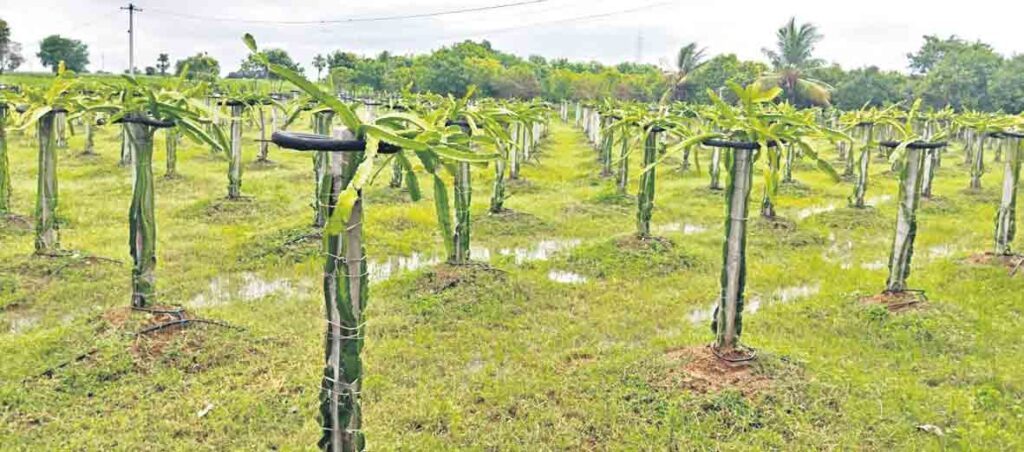 నిన్న మొన్నటి దాకా పల్లెవాసులకు అంతగా పరిచయం లేని డ్రాగన్ ఫ్రూట్ ప్రస్తుతం పల్లెటూర్లలోకి ఇప్పుడిప్పుడే ఎంటరవుతున్నది. ఈ ఫ్రూట్ గురించి, పట్టణవాసులకు మాత్రమే అంతోఇంతో తెలిసు. కానీ, పల్లెవాసులకు ఈ ఫ్రూట్ అంతగా పరిచయం లేదనే చెప్పాలి. ఎందుకంటే ఎక్కడో అమెరికా, చైనా వంటి దేశాల్లో దొరికె ఈ ఫ్రూట్.. ఇప్పుడు మన పల్లెటూర్లలో కూడా లభ్యమవుతుండడం విశేషం. రాష్ట్రంలోని పలు జిల్లాలో ఒకరిద్దరు చొప్పున ఈ డ్రాగన్ ఫ్రూట్స్ను పండిస్తున్నారు. ఇదే కోవలో మద్దూరు మండలంలోని వంగపల్లి గ్రామంలో విశ్రాంత ఉద్యోగి చల్లా కమలాకర్రెడ్డి వస్తారు. డ్రాగన్ పంటను సాగు చేస్తూ ప్రజలకు అవగాహన కల్పిస్తున్నారు. కమలాకర్రెడ్డి డిపార్ట్మెంట్ ఆఫ్ అటమిక్ ఎనర్జీలో 33ఏండ్ల పాటు ఉద్యోగం చేసి, ఇటీవలే వలంటరీ రిటైర్మెంట్ తీసుకున్నారు. తన వ్యవసాయ క్షేత్రంలో ప్రకృతి వ్యవసాయం చేస్తూ ఆదర్శగా నిలుస్తున్నారు. అలాగే విభిన్న పంటను సాగు చేయాలనే ఉద్దేశంతో సుమారు ఆరేండ్లు డ్రాగన్ ఫ్రూట్స్పై పరిశోధన చేసి, రెండేండ్ల క్రితం నుంచి ఎకరం విస్తీర్ణంలో డ్రాగన్ ఫ్రూట్స్ను సాగు చేస్తున్నారు.
