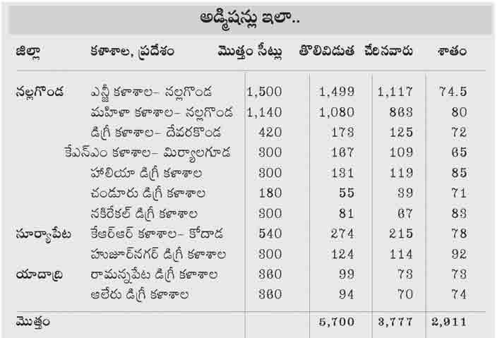 ఉమ్మడి నల్లగొండ జిల్లా వ్యాప్తంగా ఎంజీయూ పరిధిలో 11ప్రభుత్వ డిగ్రీ కళాశాలలు, రెండు ఎయిడెడ్ కళాశాలలు ఉన్నాయి. ‘దోస్త్’ తొలి విడుతలోనే అన్ని కళాశాలల్లో అత్యధికంగా సీట్లు భర్తీ కావడం గమనార్హం. వివిధ కోర్సుల్లో 5,700సీట్లు అందుబాటులో ఉన్నాయి. వీటిలో తొలి విడుతలో 3,777సీట్లకు గాను 2,911 మంది విద్యార్థులు సెల్ఫ్ రిపోర్టింగ్ చేశారు. రెండో విడుతకే మెజార్టీ కళాశాలల్లో నూరుశాతం అడ్మిషన్లు పూర్తయ్యే అవకాశాలు కనిపిస్తున్నాయి. దోస్త్ రెండో విడుత అడ్మిషన్ల ఈ నెల 25నుంచి ప్రారంభిస్తామని ఉన్నత విద్యామండలి దోస్త్ విభాగం వెల్లడించింది. తొలి విడుతలో సీట్లు రాని విద్యార్థులు రెండో విడుతలో రిజిస్ట్రేషన్ చేసుకుని ఆన్లైన్లో కళాశాల ఎంపిక చేసుకోవాల్సి ఉంటుంది.