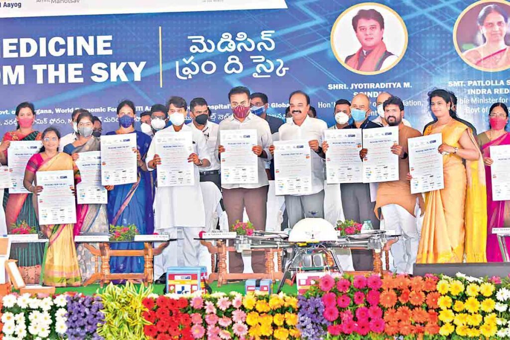 వికారాబాద్ కా హవా.. లాకో మరీజోంకా దవా.. అనే సామెత ఉంది.. ఇప్పుడు ఇదే గాలిలో ఎగురుతూ ఔషధాల్ని మోసుకెళుతున్న డ్రోన్లు.. జిల్లా వైపు దేశం మొత్తం చూసేలా చేస్తున్నాయి. ఇండియాలో మొట్టమొదటిసారిగా ‘మెడిసిన్ ఫ్రం స్కై’ పేరుతో పైలట్ ప్రాజెక్టుకు వికారాబాద్ వేదికైంది. శనివారం ఉదయం కేంద్ర విమానయాన శాఖ మంత్రి జ్యోతిరాదిత్య సింధియా, మంత్రులు కేటీఆర్, సబితారెడ్డి, ఎంపీ రంజిత్రెడ్డి ఇతర ప్రజాప్రతినిధుల సమక్షంలో ఈ కార్యక్రమాన్ని లాంఛనంగా ప్రారంభించారు. అందివస్తున్న సాంకేతిక పరిజ్ఞానం సామాన్యుడికి ఉపయోగపడాలన్నదే సీఎం కేసీఆర్ ఉద్దేశమని ప్రకటించిన మంత్రి కేటీఆర్ ఆ దిశగా అనేక ప్రయత్నాలు చేస్తున్నామన్నారు. అందులో భాగంగానే డ్రోన్ల ద్వారా ఔషధాల పంపిణీ ప్రారంభించామన్నారు. వ్యాక్సిన్లు, రక్తం ఇతర ఔషధాలను ఎటువంటి ట్రాఫిక్ ఇబ్బందులు లేకుండా నిమిషాల్లో ఇతర ప్రాంతాలకు చేరవేయడంతో సత్వర వైద్య సహాయం అందుతుందని మంత్రి కేటీఆర్ అభిప్రాయపడ్డారు. వికారాబాద్ జిల్లా కేంద్రానికి ఆరు కిలోమీటర్ల దూరంలో ఉన్న ఒక పీహెచ్సీకి ప్రయోగాత్మకంగా డ్రోన్ ద్వారా ఔషధాలు పంపిన అనంతరం రాష్ట్రం తీసుకున్న చొరవను కేంద్రమంత్రి అభినందించారు. మంత్రి సబితారెడ్డి, ఎంపీ రంజిత్రెడ్డి, ఎమ్మెల్యే ఆనంద్ మాట్లాడుతూ ఇటువంటి గొప్ప కార్యక్రమానికి వికారాబాద్ వేదిక కావడం సంతోషంగా ఉందన్నారు. ఆకాశంలో డ్రోన్ల సందడితో పట్టణమంతా పండుగ వాతావరణం కనిపించింది.