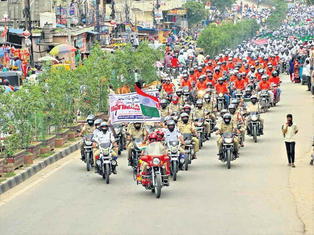 రైడ్ సేఫ్ రీడ్ సేఫ్ బైకు ర్యాలీ కార్యక్రమంలో ప్రముఖ కళాకారులు బిత్తిరి సత్తి, కొమరం తమ మాటలతో అలరించారు. హెల్మెట్ అంటే లైఫ్ అనే విషయాన్ని అందరూ గ్రహి ంచాలన్నారు. పలువురు చిన్నారులు రోడ్డు ప్రమాదాలపై కంటి కి కట్టినట్టుగా చేసిన నృత్యాలు పలువురిని అలోచింపజేశాయి. కార్యక్రమంలో కౌన్సిలర్లు బచ్చలి నర్సింహ, ప్రతాప్రెడ్డి, శ్రీనివాస్, సలేంద్రం రాజేశ్వ ర్, నాయకులు శంకర్, యుగేందర్, కిషోర్, జమృత్ఖాన్, శేఖ ర్, యాదగిరి, నాయకులు, పోలీసులు పాల్గొన్నారు.