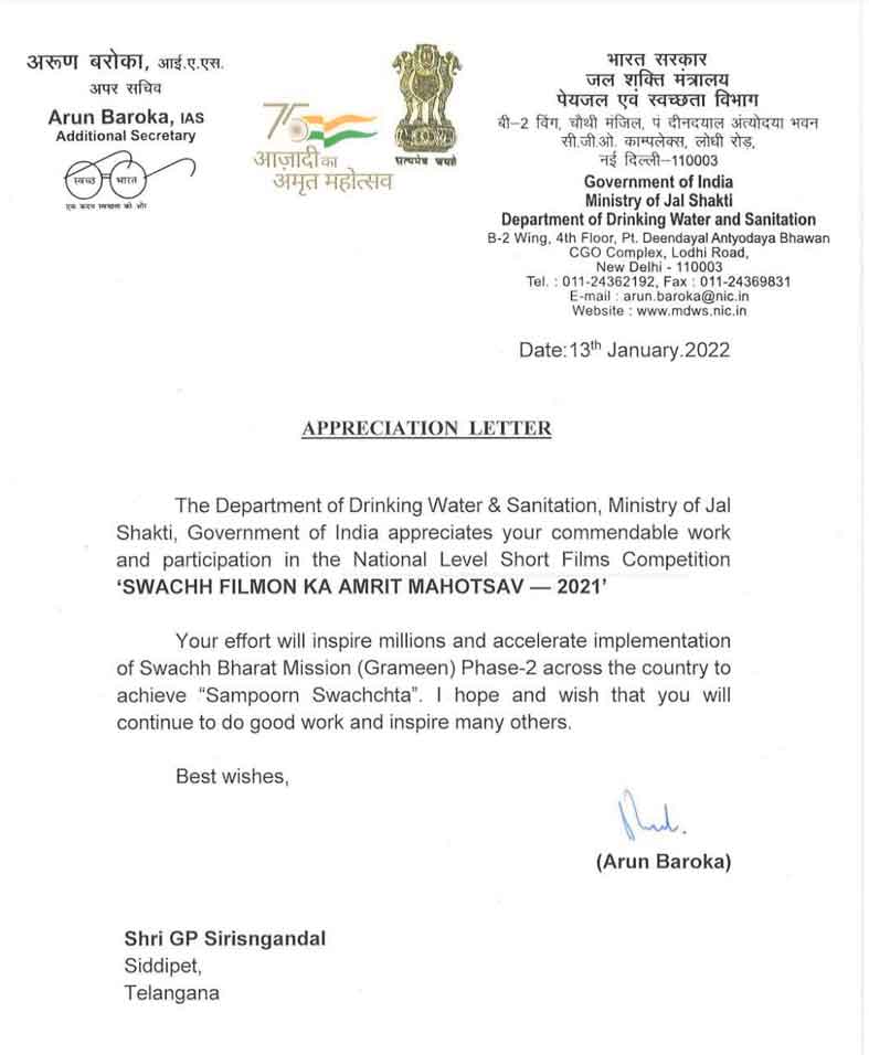 సిద్దిపేట, జనవరి 14 : స్వచ్ఛ భారత్ మిషన్ ఫేజ్-2లో భాగంగా దేశవ్యాప్తంగా ‘సంపూర్ణ స్వచ్ఛత’ సాధించేందుకు మీ పనితీరు లక్ష్యాల సాధనకు ప్రేరణ ఇస్తుంది.. తాగునీటి సరఫరా, పారిశుధ్య విభాగాల్లో సిద్దిపేట జిల్లా రాబోయే రోజుల్లో అద్భుత పనితీరును కనబరుస్తూ దేశంలోని మిగతా జిల్లాలకు స్ఫూర్తిగా నిలుస్తుందని కేంద్ర తాగునీరు, పారిశుధ్య విభాగం, జలశక్తి మంత్రిత్వ శాఖ అడిషనల్ సెక్రెటరీ అరుణ్ బరోక అభినందన లేఖలో పేర్కొన్నారు. జాతీయ స్థాయి లఘు చిత్రాల పోటీ స్వచ్ఛ ఫిల్మోన్ కా అమృత్ మహోత్సవ్ 2021లో భాగంగా జిల్లా సాధించిన ప్రగతి ఫలితాలను తెలుపుతూ జిల్లాలోని గ్రామ పంచాయతీ కార్యదర్శులు, అదనపు కలెక్టర్ ముజామ్మిల్ ఖాన్ పర్యవేక్షణలో 160పైగా చిత్రాలను రూపొందించి స్వచ్ఛమిషన్ లఘు చిత్రాల పోటీకి పంపించారు. వీటిని వీక్షించిన అరుణ్ బరోక అధికారులు, సిబ్బందిని అభినందిస్తున్నట్లు జిల్లా యంత్రాంగానికి పంపిన లేఖలో తెలిపారు.