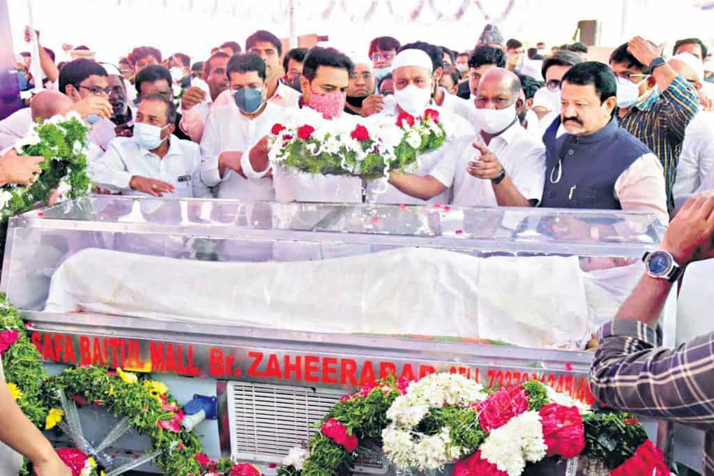 జహీరాబాద్/కోహీర్/ఝరాసంగం/న్యాల్కల్ : మాజీ మంత్రి, ఎమ్మెల్సీ మహ్మద్ ఫరీదుద్దీన్ అంత్యక్రియల్లో మంత్రులు కేటీఆర్, మహమూద్ అలీ పాల్గొని పార్థివదేహంపై పుష్పగుచ్ఛం ఉంచి నివాళులర్పించారు. ఈ సందర్భంగా మంత్రి కేటీఆర్ మాట్లాడుతూ ఫరీదుద్దీన్ ఎప్పుడూ ప్రజల సమస్యల పరిష్కారం కోసం కృషి చేసేవారన్నారు. తమ వద్దకు వచ్చిన ప్రతీసారి ప్రజల సమస్యలు చెప్పేవారని, కులమతాలకతీతంగా అందరితో కలిసిమెలిసి ఉండేవారన్నారు. సీఎం కేసీఆర్ ఆదేశాల మేరకు ప్రభుత్వ లాంఛనాలతో అం త్యక్రియలు నిర్వహించారు. రాష్ట్రంతో పాటు ఉమ్మడి మెదక్ జిల్లాకు ఫరీదుద్దీన్ ఎంతో సేవ చేశారని, అజాత శత్రువు అని అన్నారు. ఆయన అకాల మరణం టీఆర్ఎస్ పార్టీ, వారి కుటుంబానికి తీరని లోటని తెలిపారు. సీఎం కేసీఆర్ అనారోగ్య కారణంగా అంత్యక్రియలకు హాజరు కాలేదని, ఫరీదుద్దీన్ కుటుంబానికి పార్టీ అండగా ఉంటుందన్నారు. రాష్ట్ర హోం శాఖ మంత్రి మహమూద్ అలీ మాట్లాడుతూ మాజీ ఎమ్మెల్సీ ఫరీదుద్దీన్ మృతిచెందడం చాలా బాధగా ఉందన్నారు. టీఆర్ఎస్ పార్టీ మంచి నాయకుడిని కోల్పోయిందన్నారు. ఆయన ఆత్మకు శాంతి చేకూరాలన్నారు. జహీరాబాద్, మెదక్ ఎంపీలు, ఎమ్మెల్యేలు, ఎమ్మెల్సీలు, కార్పొరేషన్ చైర్మన్లు ఫరీదుద్దీన్తో తమకున్న అనుబంధాన్ని ఈ సందర్భంగా గుర్తుచేసుకున్నారు.
