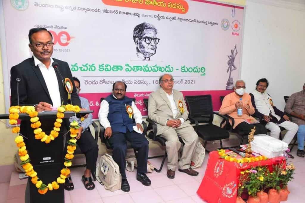 ఖమ్మం ఎడ్యుకేషన్, డిసెంబర్16: అట్టడుగు వర్గాల బతుకు చిత్రమే వచన కవితా పితామహుడు కుందుర్తి ఆంజనేయులు వచన కవిత్వం అని కాకతీయ విశ్వవిద్యాలయ వీసీ ఆచార్య తాటికొండ రమేశ్ అన్నారు. కుందుర్తి శత జయంతి సందర్భంగా గురువారం ఖమ్మం నగరంలోని ఎస్ఆర్అండ్బీజీఎన్ఆర్ తెలుగు విభాగ ప్రిన్సిపాల్ మహ్మద్ జాకీరుల్లా అధ్యక్షతన నిర్వహించిన జాతీయ సదస్సులో ఆయన మాట్లాడారు. కుందుర్తి కవిత్వంలో అనేక ప్రయోగాలు చేశారన్నారు. ఆయన సాహిత్యం నయగార జలపాతంలా ఉంటుందన్నారు. విశ్వ మానవతావాదం ఆయన కవిత్వంలో స్పష్టంగా కనిపిస్తుందన్నారు. ప్రముఖ కవి, సాహిత్య అకాడమీ పూర్వ అధ్యక్షుడు డాక్టర్ నందిని సిధారెడ్డి మాట్లాడుతూ.. సమాజ హితం కోసం కుందుర్తి కవిత్వం రాశారన్నారు. నేటి సమాజం కుందుర్తి రచనలను అధ్యయనం చేయాల్సిన అవసరం ఉందన్నారు. వరంగల్లోని యూనివర్సిటీ ఆర్ట్స్ అండ్ సైన్స్ కళాశాల ప్రిన్సిపాల్ డాక్టర్ బన్న అయిలయ్య మాట్లాడుతూ.. కుందుర్తి ప్రజల భాషనే కవిత్వంగా రాశారన్నారు. వచన కవిత్వాన్ని స్థిర పరచడానికి ఊరూరా తిరిగారన్నారు. కేయూ తెలుగు శాఖ అధ్యక్షుడు డాక్టర్ పంతంగి వెంకటేశ్వర్లు మాట్లాడుతూ.. వచన కవిత్వం స్థిరపడడానికి కుందుర్తి సేవలే కారణమన్నారు. సాహిత్య అకాడమీ సభ్యుడు, కవి శిఖామణి మాట్లాడుతూ.. కుందుర్తిపై సదస్సు నిర్వహణ అభిలషనీయమన్నారు. వచన కవిత్వంలో వివిధ సాహిత్య రూపాలను తీసుకరావడానికి ఆయన కృషి చేశారన్నారు. ప్రముఖ కవి యాకూబ్, తెలుగు కళాశాల అధ్యాపకుడు డాక్టర్ రవికుమార్ మాట్లాడుతూ సదస్సుల నిర్వహణ అభినందనీయమన్నారు. అనంతరం లెప్ట్నెంట్, డాక్టర్ జరుపుల రమేశ్ రచించిన ‘రెప్పవాల్చని కాలం’ పుస్తకాన్ని, ‘కవి సంధ్య’ మాసపత్రికను ఆవిష్కరించారు. సదస్సు కార్యనిర్వాహక కార్యదర్శి, కేయూ పాలకమండలి సభ్యుడు డాక్టర్ సీతారాం రెండు రోజుల పత్ర విశేషాలను తెలిపారు. కార్యక్రమంలో డాక్టర్ నాళేశ్వరం, శంకరం, వేణుగోపాల్, బెంగళూరు విశ్వ విద్యాలయ ఆచార్యులు ఆశాజ్యోతి, తెలంగాణ విశ్వ విద్యాలయ ఆచార్యులు డాక్టర్ చాలం శ్రీనివాసమూర్తి తదితరులు పాల్గొన్నారు.