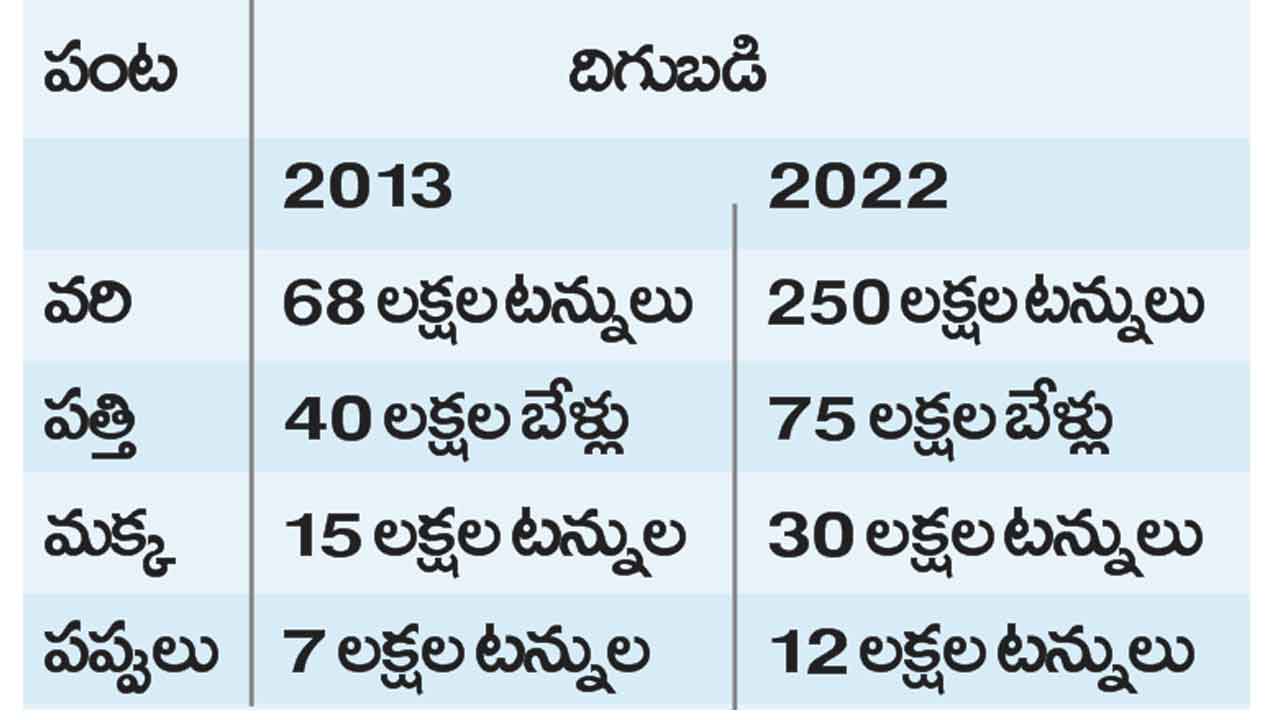 తెలంగాణ వ్యవసాయ రంగంలో జరిగిన మార్పు ఎంత గొప్పదో గణాంకాలే స్పష్టంగా తెలియజేస్తున్నాయి. 2013 కాలానికి ముందు పరిస్థితులను తీసుకుంటే, మొత్తం ఆహార ధాన్యాల ఉత్పత్తి సుమారు 90 లక్షల టన్నుల వరకు మాత్రమే ఉండేది. ఇందులో వరి ఉత్పత్తి సుమారు 68 లక్షల టన్నులు, మక్క సుమారు 15 లక్షల టన్నులు, పప్పుధాన్యాలు కలిపి 7 లక్షల టన్నుల వరకు ఉండేవి.