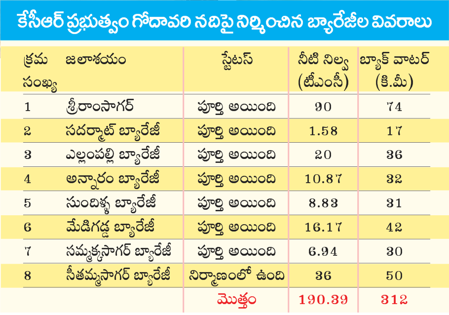 ‘గలగలా గోదారి కదలిపోతుంటేను బిరబిరా కృష్ణమ్మ పరుగులిడుతుంటేను బంగారు పంటలే పండుతాయి మురిపాల ముత్యాలు దొరలుతాయి’ తెలంగాణ రాష్ట్రం ఏర్పడ్డాక ఉద్యమ నాయకుడు కేసీఆర్ పాలనా పగ్గాలు చేపట్టారు. నీటి పారుదల ప్రాజెక్టులపై ప్రత్యేక దృష్టి సారించారు. జల సంకల్పం తీసుకొని అసాధ్యాన్ని సుసాధ్యం చేశారు. నెర్రెలు వారిన నేలలకు గోదావరి జలాలను పారించారు. సమైక్య పాలనలో నిర్లక్ష్యానికి గురైన తెలంగాణ నీటిపారుదల రంగాన్ని మహోన్నతంగా తీర్చిదిద్దారు. అపర భగీరథుడిగా రైతుల కన్నీళ్లు తుడిచి, కాలువల్లోకి నీళ్లు ప్రవహింపజేశారు. ఆంధ్రా జల దోపిడీకి అడ్డుకట్ట వేస్తూ, తెలంగాణ హక్కులను పరిరక్షించారు. కేసీఆర్ ప్రభుత్వం పదేండ్లలో గోదావరి నదిపై 7 బ్యారేజీలను నిర్మించింది. తెలంగాణకు స్వర్ణయుగంగా నిలిచిన కేసీఆర్ పాలనలో బ్యారేజీల నిర్మాణం శరవేగంగా పూర్తి చేసుకొని రికార్డులు సృష్టించింది.
