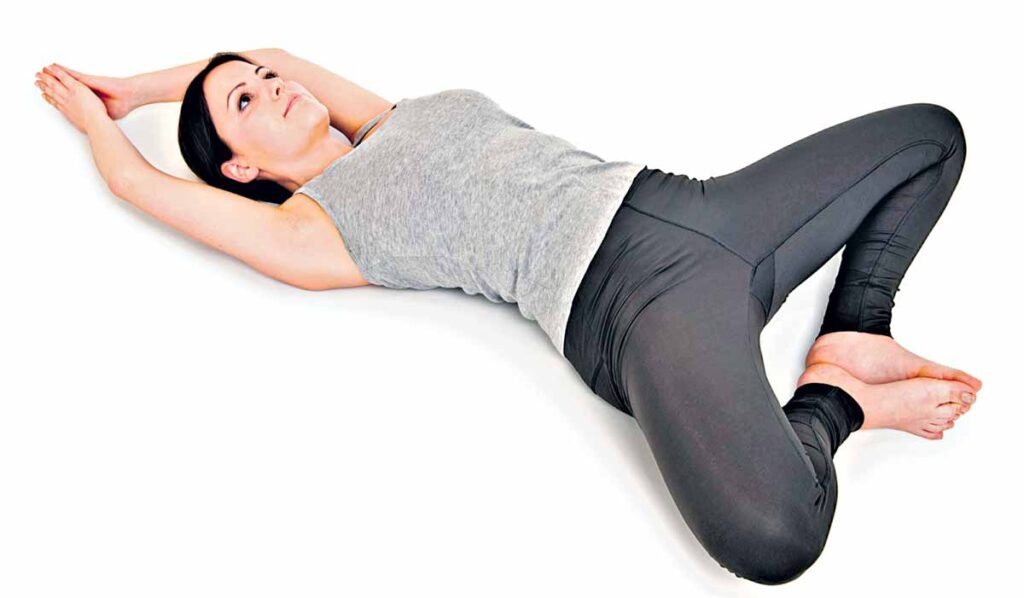 ముందుగా చాపమీద వెల్లకిలా పడుకోవాలి. ఇబ్బందిగా ఉన్నవాళ్లు వీపు కింద దిండు, మెత్తటి దుప్పటి కూడా పెట్టుకోవచ్చు.ఇప్పుడు, చిత్రంలో చూపిన విధంగా రెండు కాళ్లనూ పైకి మడవాలి. రెండు పాదాలు ఒక దానిని ఒకటి పూర్తిగా ఆనుకుని ఉండేలా జాగ్రత్తపడాలి. అలా అని శరీరం మీద ఒత్తిడి వేయకూడదు.