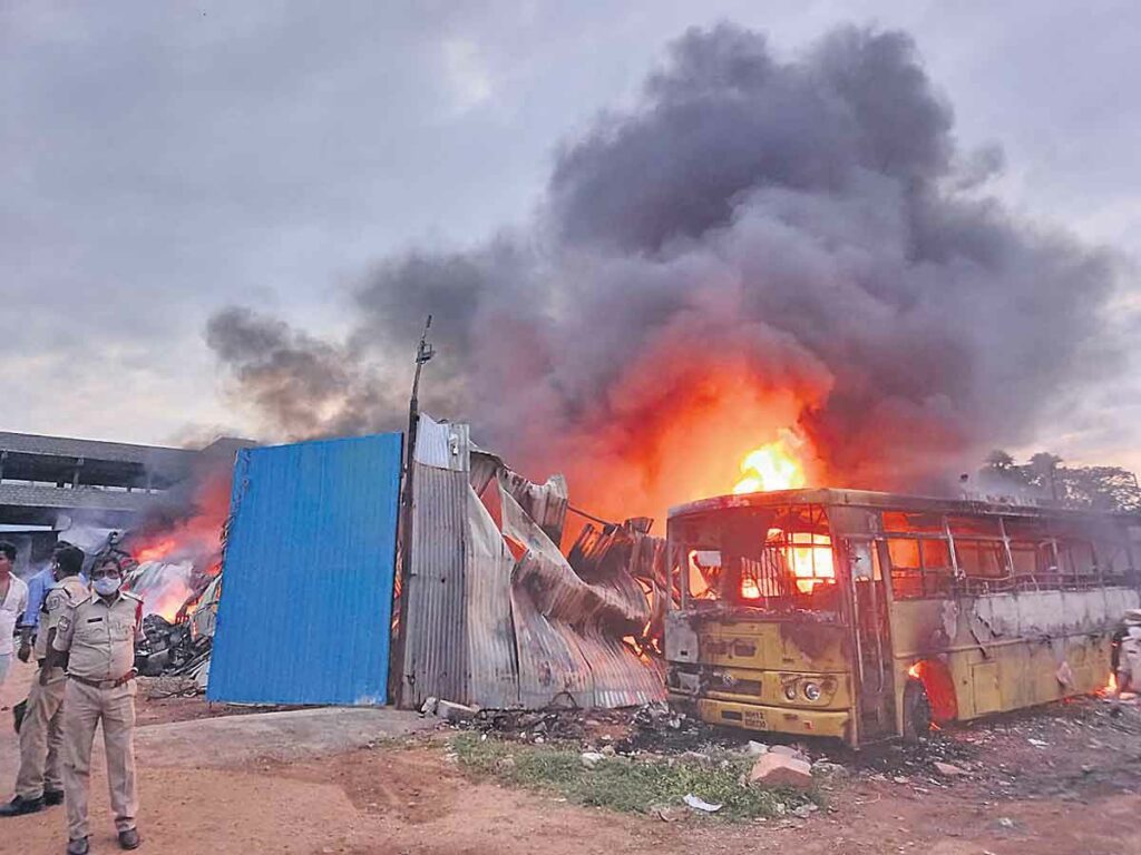 మన్సూరాబాద్, ఆగస్టు 1: విద్యుత్ షార్ట్ సర్క్యూట్తో స్క్రాప్ గోదాంలో భారీ అగ్ని ప్రమాదం జరిగింది. ప్రమాదంలో ఒక బస్సు, రెండు ఆటోలు, గోదాంలోని ప్లాస్టిక్, ఇనుప వ్యర్థాలు పూర్తిగా దగ్ధమయ్యాయి. ఎల్బీనగర్ పోలీస్స్టేషన్ పరిధిలో జరిగిన ఈ ఘటనలో సుమారు రూ. 50 లక్షల మేర ఆస్తినష్టం జరిగింది. సీఐ అశోక్రెడ్డి కథనం ప్రకారం.. ఎల్బీనగర్ నివాసి బాలెముల జలపతిరెడ్డి సాగర్ రింగ్రోడ్డు సమీపంలోని అలేఖ్య టవర్స్ ఎదురుగా ఉన్న ఖాళీ స్థలంలో స్క్రాప్ గోదాం (ప్లాస్టిక్, ఇనుప వ్యర్థాల)ను నిర్వహిస్తున్నాడు. వివిధ ప్రాంతాల నుంచి కొనుగోలు చేసిన ప్లాస్టిక్, ఇనుప వ్యర్థాలను ఇక్కడ డంప్ చేసి విక్రయిస్తారు. రోజు మాదిరిగానే శనివారం రాత్రి గోదాంను మూసిచేసి ఇంటికి వెళ్లి పోయాడు.