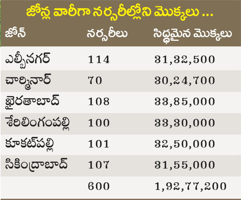 కాలనీలు పచ్చదనంతో కళకళలాడాలని ఇప్పటికే ప్రభుత్వ ప్రధాన కార్యదర్శి సోమేశ్కుమార్ బల్దియా ఉన్నతాధికారులను ఆదేశించిన నేపథ్యంలో ఈసారి హరితహారంలో కోటి 25 లక్షల మొక్కలే లక్ష్యంగా కార్యాప్రణాళిక సిద్ధమైంది. ఇందుకోసం 970 చోట్ల ఖాళీ స్థలాలను ఎంపిక చేశారు. అక్కడ అడవి వాతావరణాన్ని సృష్టించేందుకు బల్దియా ఈసారి దేశవాళీ మొక్కలకు ప్రాధాన్యమిచ్చింది. నర్సరీల్లో రావి, మర్రి, వేప, కానుగ, చింత తదితర మొక్కలను పెద్ద ఎత్తున పెంచింది. కాలనీ ప్లాంటేషన్లో భాగంగా 3వేల కాలనీలను వంద శాతం గ్రీనరీగా మలిచేందుకు నిర్ణయం తీసుకున్నారు. డిసెంబర్ నెలాఖరు నాటికల్లా ఎంపిక చేసిన కాలనీల్లో అంతర్గత రహదారులు, ఇనిస్టిట్యూషన్స్, ఖాళీ స్థలాల్లో విరివిగా మొక్కలు నాటి పచ్చదనం పెంపొందించనున్నారు. మరోవైపు ఈ ఏడాది మరో 160 కిలోమీటర్లలో మల్టీలెవల్ అవెన్యూ ప్లాంటేషన్ చేపట్టనున్నారు. అలాగే 185 చెరువుల్లో 18 చోట్ల గ్రీనరీ పనులు చేపట్టగా..మిగిలినవి ఈ ఏడాది పూర్తి చేయనున్నారు.