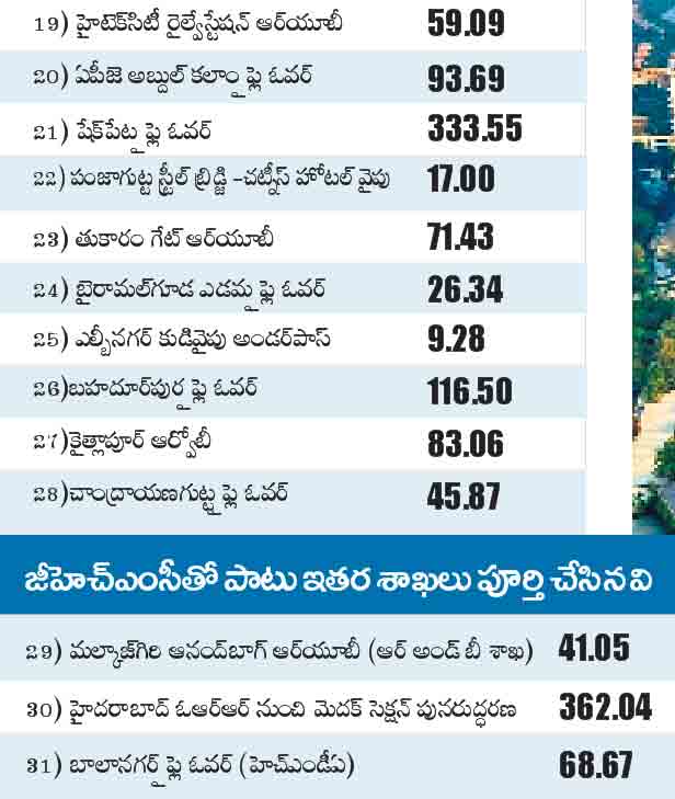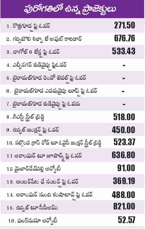 టోలిచౌకి నుంచి రాయదుర్గం వెళ్లే మార్గంలో షేక్పేట వద్ద నిర్మించిన పై వంతెన కేవలం ఐటీ కారిడార్కు త్వరగా ఆ పరిసర ప్రాంతాల ముఖచిత్రాన్నే మార్చివేసింది. అబ్దుల్ కలాం ఫ్లైఓవర్, చాంద్రాయణ గుట్ట ఫ్లై ఓవర్, బహుదూర్ పుర ఫ్లై ఓవర్ లు పాతనగర వాసులకు ప్రయాణ భారాన్ని బాగా తగ్గించగలిగాయి. ఇప్పటి వరకు రూ.3748.85కోట్లతో నిర్మితమైన 31 ప్రాజెక్టులు అందుబాటులోకి వచ్చాయి. 15 ఫ్లై ఓవర్లు, 5 అండర్పాస్లు, 7 ఆర్వోబీ/ఆర్యూబీలు, ఒక కేబుల్ బ్రిడ్జి వంటి నిర్మాణాలతో అనేక చోట్ల దాదాపుగా ట్రాఫిక్ సమస్యకు చెక్ పడింది. మరో 16 చోట్ల 4304.07 కోట్ల వ్యయంతో సాగుతున్న పనులు పురోగతిలో ఉన్నాయి. అవి ఈ ఏడాది ఆఖరు నాటికి పూర్తయ్యే అవకాశం ఉందని జీహెచ్ఎంసీ అధికారులు వెల్లడించారు.