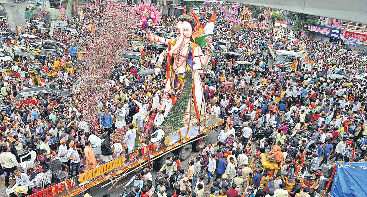 శుక్రవారం ఉదయం నుంచే నగర వీధులు గణపయ్య నామ స్మరణతో మారుమోగాయి. హుస్సేన్ సాగర్, సరూర్ నగర్, సఫిల్గూడ, కూకట్పల్లి ఐడీఎల్ చెరువులో నిమజ్జనానికి వేల సంఖ్యలో ఉత్సవ విగ్రహాలు తరలివచ్చాయి. కిలోమీటర్ల పొడవున రోడ్లపై నిలిచిపోయాయి. వర్షం కారణంగా శోభాయాత్ర నెమ్మదిగా సాగగా.. తీరొక్క గణపతి ప్రతిమలను భక్తులు తిలకిస్తూ సందడి చేశారు.