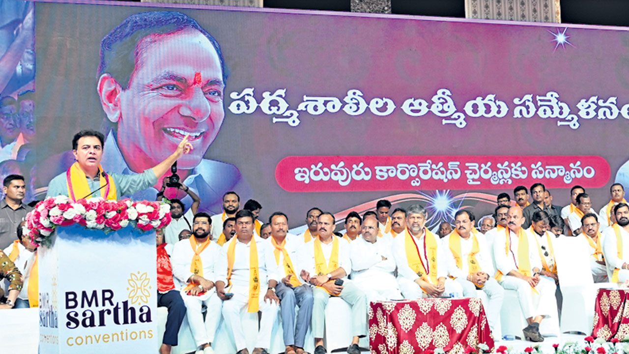 హైదరాబాద్, అక్టోబర్ 21 (నమస్తే తెలంగాణ) : తెలంగాణ రాష్ట్రంలో “చేనేత ప్రభుత్వం” అధికారంలో ఉన్నదని టీఆర్ఎస్ పార్టీ వర్కింగ్ ప్రెసిడెంట్, రాష్ట్ర చేనేత, జౌళి శాఖ మంత్రి కేటీఆర్ అన్నారు. కేంద్రంలోని మోదీ ప్రభుత్వం చేనేతలకు ఉరితాళ్లు మిగుల్చుతున్నదని తెలిపారు. శుక్రవారం రంగారెడ్డి జిల్లాలోని మన్నెగూడ బీఎంఆర్ సార్థ ఫంక్షన్ హాల్లో పద్మశాలీల ఆత్మీయ సమ్మేళనం జరిగింది. ఈ సందర్భంగా హ్యాండ్లూమ్ కార్పొరేషన్ చైర్మన్ చింత ప్రభాకర్, పవర్లూమ్ కార్పొరేషన్ చైర్మన్ గూడూరి ప్రవీణ్లను మంత్రి కేటీఆర్ సన్మానించారు.