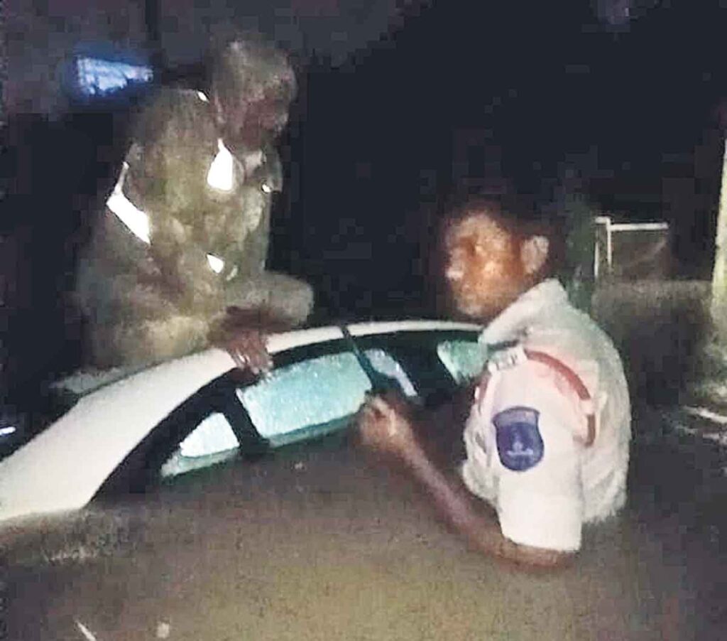 కోకాపేట సర్కిల్ రోటరీ అండర్పాస్ బ్రిడ్జి వద్ద నీటిలో మునిగిన ఓ కారు సైబరాబాద్ ట్రాఫిక్ పోలీసులను తీవ్రంగా కలవరపెట్టింది. ఓ సందర్భంలో అందులో ఎవరైనా ఉండి ప్రమాదంలో ఉన్నారా అనే ఆందోళనను గురి చేసింది. గచ్చిబౌలి ట్రాఫిక్ ఎస్ఐ విజయ్నాయక్ ఆ నీటి ముంపులో వెళ్లి..కారులో ఎవరున్నారని ఆరా తీశారు. ఎవరూ లేకపోవడంతో ఊపిరీ పీల్చుకున్నారు.
