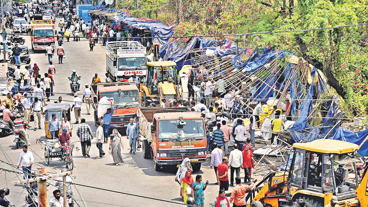 చార్మినార్: చార్మినార్ జీహెచ్ఎంసీ సర్కిల్ పరిధిలోని ముర్గీచౌక్, మదీనా, హై కోర్టు ప్రధాన రోడ్డు మార్గంలో రోడ్లకు ఇరువైపులా కొనసాగుతున్న చిరు వ్యాపారులపై అధికారులు తమ ప్రతాపాన్ని ప్రదర్శించారు. రోడ్లను ఆక్రమించారనే కారణంతో ఎలాంటి ముందస్తు నోటీసులు జారీ చేయకుండానే కూల్చివేతలకు పాల్పడ్డారు. కాగా, ముర్గీచౌక్, మదీనా పటేల్ మార్కెట్ రోడ్డు మార్గంలో కూల్చివేతలకు పాల్పడుతున్న సమయంలో అధికారుల చర్యలపై స్థానిక వ్యాపారులు నిరసన వ్యక్తంచేశారు.