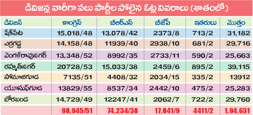 నియోజకవర్గంలోని ఏడు డివిజన్లకు గానూ బీఆర్ఎస్ పార్టీకి 74,234 ఓట్లు వచ్చాయి. ఇందులో షేక్పేట, ఎర్రగడ్డ, బోరబండ డివిజన్లలో బీఆర్ఎస్, కాంగ్రెస్కు పోటీనిచ్చింది. షేక్పేటలో బీఆర్ఎస్కు 13,078 ఓట్లు(42శాతం), ఎర్రగడ్డలో 11,939 ఓట్లు(40శాతం), బోరబండలో 12,247 ఓట్లు(41శాతం)తో కాంగ్రెస్ను గట్టిగా ఎదుర్కొన్నది. కాగా ఈ మూడు డివిజన్లలో ముస్లిం ఓటర్లు బీఆర్ఎస్ పక్షానే అత్యధికంగా నిలిచారు.
