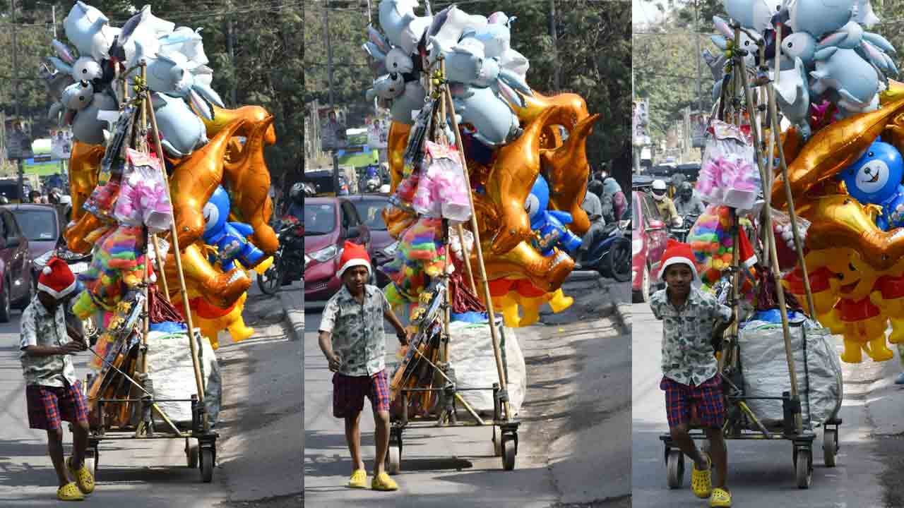 రెక్కాడితేగానీ డొక్కాడదన్నట్టు.. క్రిస్మస్ రోజున ఈ పిల్లాడు రోడ్ల వెంబడి బొమ్మలు అమ్ముతూ కనిపించాడు. తలకు శాంతాక్లాజ్ టోపీ ధరించి చక్రాల బండిని లాగుతూ ‘బొమ్మలమ్మ.. బొమ్మలు’ అంటూ తిరుగుతున్నాడు. దారిన పోతున్నవాళ్లు ‘అయ్యో ఎవరి బిడ్డో.. ఇంత చిన్నవయసులోనే బతుకు బండి లాగేందుకు ఎన్ని తిప్పలు పడుతున్నాడో’నని అతడిపై జాలి చూపించారు. కానీ ఆ బాలుడు మాత్రం ఈ కష్టం నాకు అలవాటే అన్నట్టుగా ముందుకు సాగుతూ.. చిరునవ్వులు చిందిస్తూ అందరికీ క్రిస్మస్ శుభాకాంక్షలు తెలిపాడు. చిన్నపిల్లలు అమితంగా ఇష్టపడే డోరెమాన్ డైనోసార్ వంటి కార్టూన్ బొమ్మలు అమ్ముతున్న ఆ బాలుడిని ‘నమస్తే తెలంగాణ’ కెమెరామెన్ క్లిక్మనిపించాడు.
