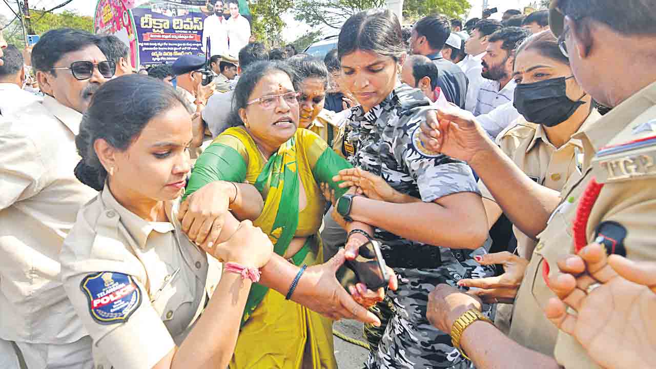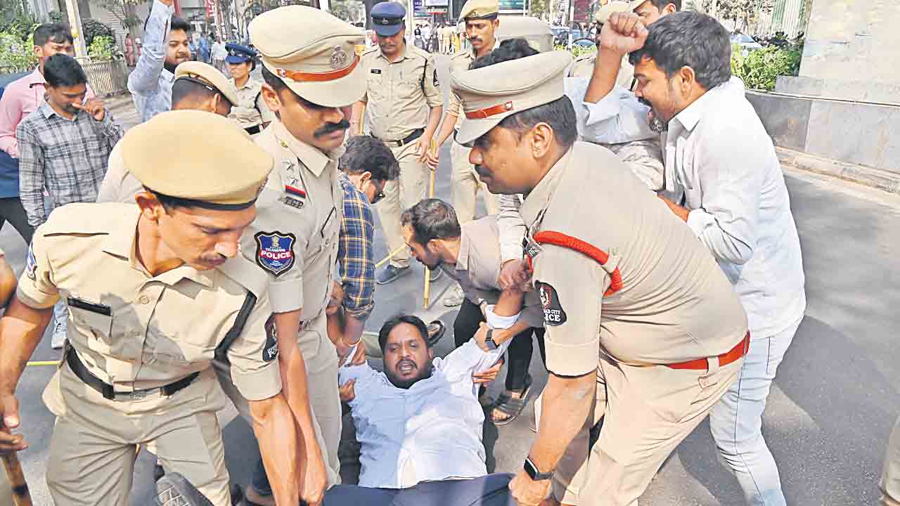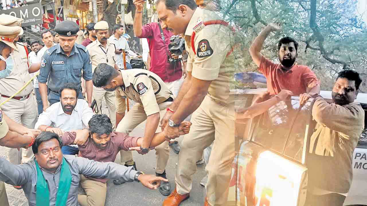 బంజారాహిల్స్/ఉస్మానియా యూనివర్సిటీ, జనవరి 23: తమ అభిమాన నేత, బీఆర్ఎస్ వర్కింగ్ ప్రెసిడెంట్ కేటీఆర్ను అకారణంగా విచారణ పేరుతో ఇబ్బంది పెట్టడాన్ని ఖండించడంతో పాటు ఆయనకు మద్దతుగా జూబ్లీహిల్స్ పీఎస్ వద్దకు బయలుదేరిన బీఆర్ఎస్ శ్రేణులు, నాయకులు, అభిమానులను పోలీసులు అడుగడుగునా అడ్డుకునే ప్రయత్నం చేశారు. కొన్నిచోట్ల పోలీసులకు, బీఆర్ఎస్ శ్రేణులకు మధ్య తోపులాట జరగడంతో ఉద్రిక్త వాతావరణం నెలకొంది. వివరాల్లోకి వెళ్తే.. ఫోన్ ట్యాపింగ్ కేసులో శుక్రవారం బీఆర్ఎస్ వర్కింగ్ ప్రెసిడెంట్ కేటీఆర్ను సిట్ అధికారులు జూబ్లీహిల్స్ పోలీస్స్టేషన్లో సుమారు ఏడున్నర గంటలపాటు విచారించారు.
