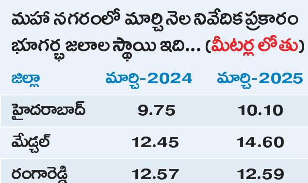 హైదరాబాద్ నగరంలో భూగర్భజలాలు గణనీయంగా పడిపోతున్నాయి. ఈ ఏడాది నెల ముందుగానే ఉష్ణోగ్రతలు పెరగడంతో నగరవ్యాప్తంగా భూగర్భజలాల నీటిమట్టం మరింత లోతునకు పడిపోయింది. హైదరాబాద్ జిల్లాలో గత ఏడాది మార్చిలో 9.75 మీటర్ల స్థాయిలో ఉన్న భూగర్భజలాలు ఇప్పుడు 10.10 మీటర్లకు పడిపోయాయి. మేడ్చల్ జిల్లాలో పరిస్థితి మరింత దారుణంగా ఉంది. ఇక్కడ గత ఏడాది మార్చిలో 12.45 మీటర్లలోతున్న ఉంటే ఇప్పుడు ఏకంగా 14.60 మీటర్ల లోతుల్లోకి పోతేగానీ భూగర్భజలాలు అందేలాలేవు. రంగారెడ్డిలోనూ ఇప్పుడు 12.59 మీటర్ల లోతున జలాలు అందుబాటులో ఉండటం పరిస్థితి తీవ్రతకు అద్దం పడుతున్నది.