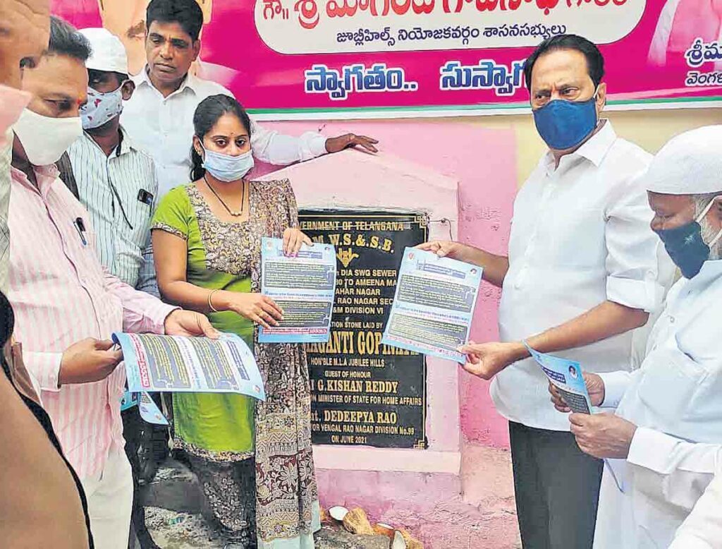 వెంగళరావునగర్, ఆగస్టు 10: జూబ్లీహిల్స్ నియోజకవర్గాన్ని అభివృద్ధి చేయడమే తన ధ్యేయమని జూబ్లీహిల్స్ ఎమ్మెల్యే మాగంటి గోపీనాథ్ అన్నారు. మంగళవారం వెంగళరావునగర్ డివిజన్ మసీదుగడ్డ వద్ద రూ. 21 లక్షల వ్యయంతో నిర్మించిన మూడు సీవరేజీ లైన్ల పనులను కార్పొరేటర్ దేదీప్య విజయ్తో కలిసి ప్రారంభించారు. అనంతరం ఉచిత తాగునీటి పథ కానికి సంబంధించిన కరపత్రాలను విడుదల చేశారు. వాటర్ వర్క్స్ మేనేజర్ రమేశ్, వర్క్ ఇన్స్పెక్టర్ శంకర్, టీఆర్ఎస్ డివిజన్ ప్రధాన కార్యదర్శి వేణు, మాజీ కార్పొరేటర్ శ్యామ్రావు, వేణుగోపాల్ యాదవ్, చిన్న రమేశ్, నవాజ్, అఫ్సర్, సత్యనారాయణ, పూజారి బాలరాజు, శంకర్ పాల్గొన్నారు. వెంగళరావునగర్ను ఆదర్శ డివిజన్గా తీర్చి దిద్దడమే తన లక్ష్యమని వెంగళరావునగర్ కా ర్పొరేటర్ దేదీప్య విజయ్ అన్నారు. మంగళవారం జవహర్ నగర్లో రూ. 10 లక్షల నిధులతో సీసీ రోడ్డు నిర్మాణ పనులను ఆమె ప్రారంభించారు.