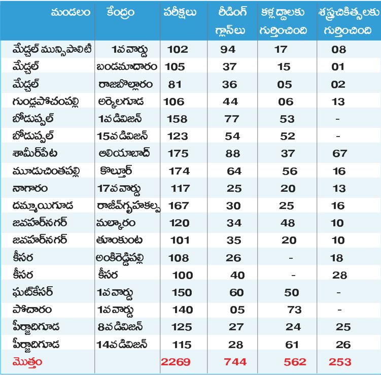 మేడ్చల్, జనవరి 20 : కంటి వెలుగు శిబిరానికి రెండో రోజు అనూహ్య స్పందన లభించింది. నియోజకవర్గ వ్యాప్తంగా ఉన్న మేడ్చల్, శామీర్పేట, కీసర, ఘట్కేసర్, మూడుచింతపల్లి మండలాలు, పీర్జాదిగూడ, బోడుప్పల్, జవహర్నగర్ కార్పొరేషన్లతో పాటు ఏడు మున్సిపాలిటీల్లో 18 కంటి వెలుగు కేంద్రాలను ఏర్పాటు చేశారు. ఆయా కేంద్రాల్లో 2269 మందికి నేత్ర వైద్య పరీక్షలు నిర్వహించారు. 744 మందికి రీడింగ్ గ్లాసెస్ ఇవ్వగా, 253 మందికి శస్త్ర చికిత్సలు అవసరమని గుర్తించారు. కేంద్రాల వారీగా చేసిన పరీక్షలు ఈ విధంగా ఉన్నాయి. కీసర మండల కేంద్రంలోని నిర్వహించిన కంటి వెలుగు శిబిరాన్ని డిప్యూటీ డీఎంహెచ్వో డాక్టర్ నారాయణరావు సందర్శించారు. ఆయనతో పాటు కీసర మండల వైద్యాధికారి డాక్టర్ సరిత ఉన్నారు.