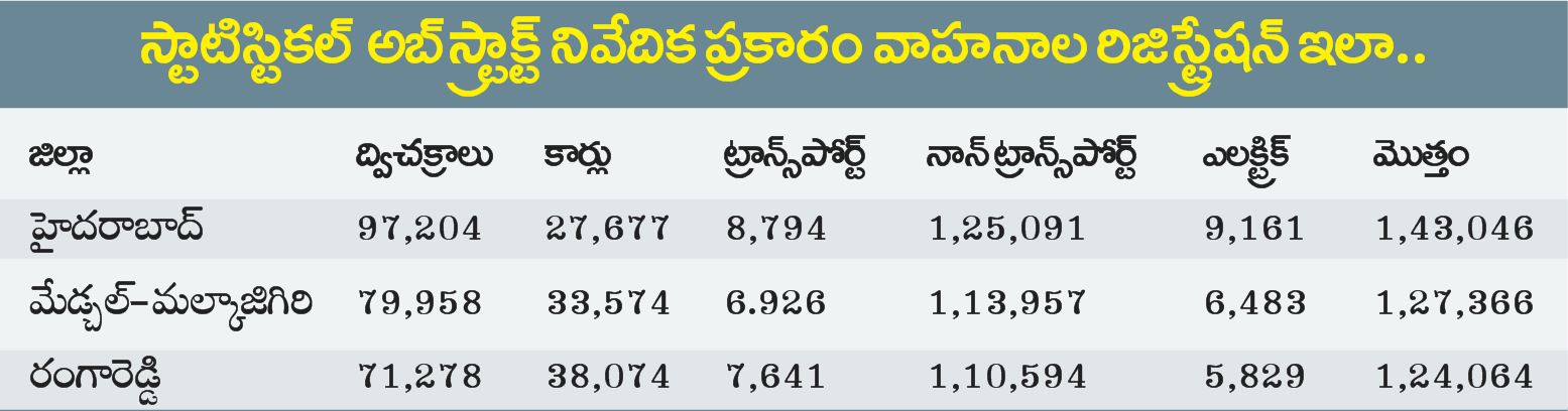 సిటీబ్యూరో, జనవరి 25 ( నమస్తే తెలంగాణ ) : కార్ల రిజస్ట్రేషన్లలో రంగారెడ్డి జిల్లా టాప్ గేర్లో దూసుకెళ్తున్నది. తెలంగాణ స్టేట్ స్టాటిస్టికల్ అబ్స్ట్రాక్ట్ నివేదిక 2021-22 ప్రకారం 38,074 కార్లతో జిల్లా అగ్ర స్థానంలో నిలువగా తర్వాతి స్థానంలో మేడల్చ్ మల్కాజిగిరి , హైదరాబాద్ రెండు, మూడు స్థానాల్లో నిలిచాయి. అలాగే వివిధ వాహనాల రిజిస్ట్రేషన్లలో హైదరాబాద్ అగ్రస్థానంలో ఉంది. రాష్ట్రంలోనే అత్యధికంగా వాహనాలు రిజిస్ట్రేషన్ అయిన జిల్లాగా హైదరాబాద్ స్థానం సంపాదించుకుంది. 2021-22లో 1.43లక్షల వాహనాలు రిజిస్ట్రేషన్ అయ్యాయి. ఈ వివరాలను తెలంగాణ స్టేట్ స్టాటిస్టికల్ అబ్స్ట్రాక్ట్ నివేదిక వెల్లడించింది. తర్వాత స్థానంలో మేడ్చల్-మల్కాజిగిరి నిలిచింది. 1.27లక్షల వాహనాలు రిజిస్ట్రేషన్ అయ్యాయి. రంగారెడ్డి 1.24లక్షల వాహనాలతో మూడో స్థానంలో ఉంది. స్టాటిస్టికల్ అబ్స్ట్రాక్ట్ నివేదిక తెలంగాణలో గత ఏడాది రిజిస్ట్రేషన్ అయిన వాహనాల వివరాలను వెల్లడించింది. ఈ మేరకు రాష్ట్రం మొత్తంలో 8.79లక్షల వాహనాలు రిజిస్ట్రేషన్ అవగా.. హైదరాబాద్, రంగారెడ్డి, మేడ్చల్ జిల్లాల్లో 3,94,476 వాహనాలు రిజిస్ట్రేషన్ కావడం విశేషం. ఇందులో అధికంగా 3,49,500 నాన్ ట్రాన్స్పోర్ట్ వాహనాలు రిజిస్ట్రేషన్ అయ్యాయి. అంతేకాదు గత ఏడాది ఎలక్ట్రిక్ వాహనాల రిజిస్ట్రేషన్ కూడా పెరిగింది. మూడు జిల్లాలు కలిపి 15,673 ఎలక్ట్రిక్ వాహనాలు రిజిస్ట్రేషన్ అయ్యాయి.