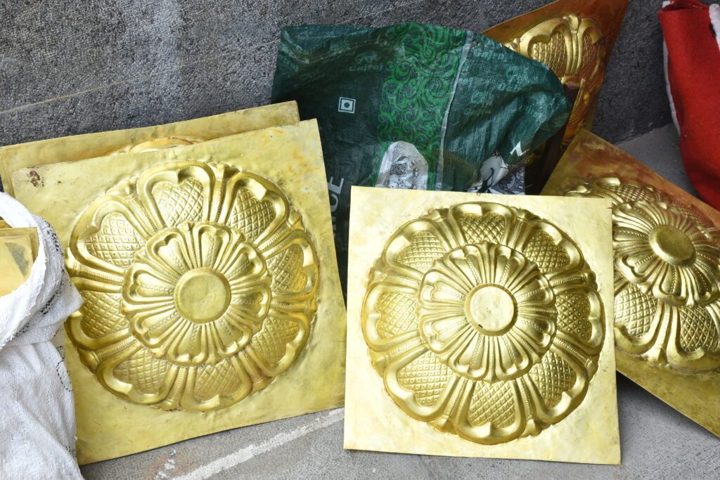 సుమారు 2,600 కేజీల ఇత్తడితో తూర్పు, పడమర, ఉత్తర, దక్షిణం గల పంచతల రాజగోపురాలకు గల ద్వారాల దర్వాజలకు పద్మాలు, లతతోపాటు శంకు చక్రనామాలతో కూడిన ఇత్తడి తొడుగులు బిగించనున్నారు. ఇప్పటికే ప్రధానాలయానికి నిర్మించిన దక్షిణం, ఉత్తర బాగంలో గల దర్వాజలకు బిగింపు ప్రక్రియ పూర్తి కాగా, మిగతా తూర్పు, పడమర దర్వాజలకు పనులు కొనసాగుతున్నాయి. ఒక్కో ద్వారం దర్వాజలకు 36 పద్మాలను అమర్చనున్నామని స్వర్ణకారులు తెలిపారు.