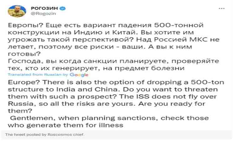 అలాంటి అవకాశాలతో మీరు బెదిరించాలనుకుంటున్నారా? అని అమెరికాను రోస్కోస్మోస్ చీఫ్ ఘటుగా ప్రశ్నించారు. ‘ఐఎస్ఎస్ రష్యా మీదుగా ప్రయాణించదు. కాబట్టి అది కూలితే అన్ని నష్టాలు మీకే. దానికి మీరు సిద్ధంగా ఉన్నారా?’ అని మరో ట్వీట్లో ఆయన వార్నింగ్ ఇచ్చారు. అందువల్ల బాధ్యతారాహిత్యంగా ప్రవర్తించవద్దని అమెరికాకు సూచించారు.