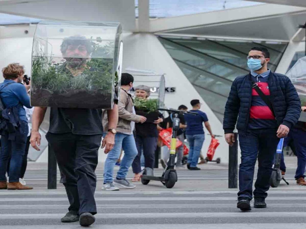 బ్రస్సెల్స్: కరోనా నేపథ్యంలో గత రెండేండ్లుగా ప్రపంచ వ్యాప్తంగా ప్రజలు మాస్కులు ధరిస్తున్నారు. ఈ నేపథ్యంలో ముఖాలకు మాస్కులతో సహజత్వాన్ని కోల్పోతున్నారు. అయితే, బెల్జియన్ దేశానికి చెందిన కళాకారుడు అలైన్ వెర్ష్యూరెన్, వినూత్న ఆలోచనతో ముందుకు వచ్చాడు. మాస్క్కు బదులు ఔషధ మొక్కలున్న పారదర్శక గాజు బాక్స్ను హెల్మెట్ మాదిరిగా తలకు ధరిస్తున్నాడు. దీనికి ‘పోర్టబుల్ ఒయాసిస్’ అని పేరు పెట్టాడు.