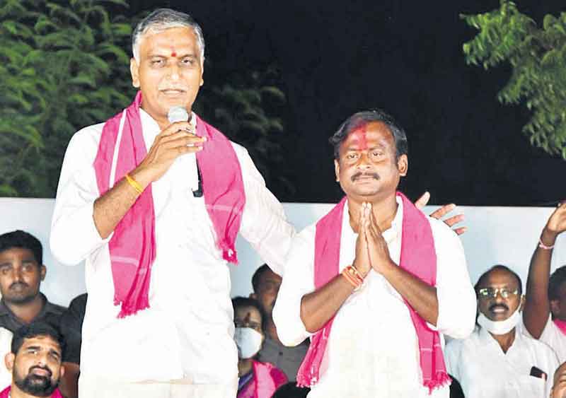 టీఆర్ఎస్ కారు గుర్తుకు ఓటేసి గట్టిగా బుద్ధి చెప్పాలని కోరారు. మంత్రిగా పేదల కోసం ఒక్క ఇల్లు కూడా కట్టియ్యలేని ఈటల.. రేపు మళ్ల గెలిపిస్తే ఉత్త ఎమ్మెల్యేగా ఏం చేస్తవో జెర చెప్పాలని ప్రశ్నించారు. ఇదే వేదికపై నుంచి చెప్తున్నా ఎన్నికల తర్వాత 5వేల ఇండ్ల కట్టించుడే కాదు, సొంత జాగలున్న వాళ్లందరూ ఇల్లు కట్టుకునేందుకు రూ.5.04 లక్షలు అందిస్తామని ప్రకటించారు. స్వార్థం కోసం రాజీనామా చేసి, ఎన్నికలు తెచ్చిన ఈటలను ఓడించాలని విజ్ఞప్తి చేశారు. మేం గెలిస్తే ఏం చేస్తమో ఇంత స్పష్టంగా చెప్తున్నామని మరి ఈటల గెలిస్తే నరేంద్రమోడీకి చెప్పి మా అక్కాచెల్లెళ్ల కోసం గ్యాస్ ధరను రూ.500 వరకు తగ్గిస్తడా? పెట్రోల్, డీజిల్ ధరలను తగ్గిస్తడా అని ప్రశ్నించారు. రాష్ట్రంలో గీత కార్మికులకు చెట్టు పన్ను రద్దు చేసి నీరా పాలసీ తీసుకొచ్చామని, రానున్న రోజుల్లో మోటార్ సైకిళ్లు ఇచ్చే ఆలోచన ఉన్నట్లు పేర్కొన్నారు. మహిళా సంఘాలకు పక్కా భవనాలు కట్టిస్తున్నమా? లేదా? అని ప్రశ్నించారు. ఈటల రాజేందర్ గెలిచినా, ఓడినా బీజేపీలో మాత్రం ఉండడట అని బీజేపీ కార్యకర్తలే చెప్పుకుంటున్నారని, కొందరు ఓటర్లను తప్పుదోవ పట్టించేందుకు రోడ్డు రోలరు గుర్తును, కోలపీట గుర్తును పెట్టుకుని తిరుగుతున్నారని, మన కారు గుర్తు పై నుంచి రెండోదని చెప్పారు. ఈ విషయం అందరికీ అర్థమయ్యేలా చూడాలని కార్యకర్తలకు సూచించారు. వృద్ధులు ఓటు వేసేందుకు వెళ్లినప్పుడు అక్కడ కారు గుర్తు గురించి అడిగి ఓటు వేయాలని విజ్ఞఫ్తి చేశారు.