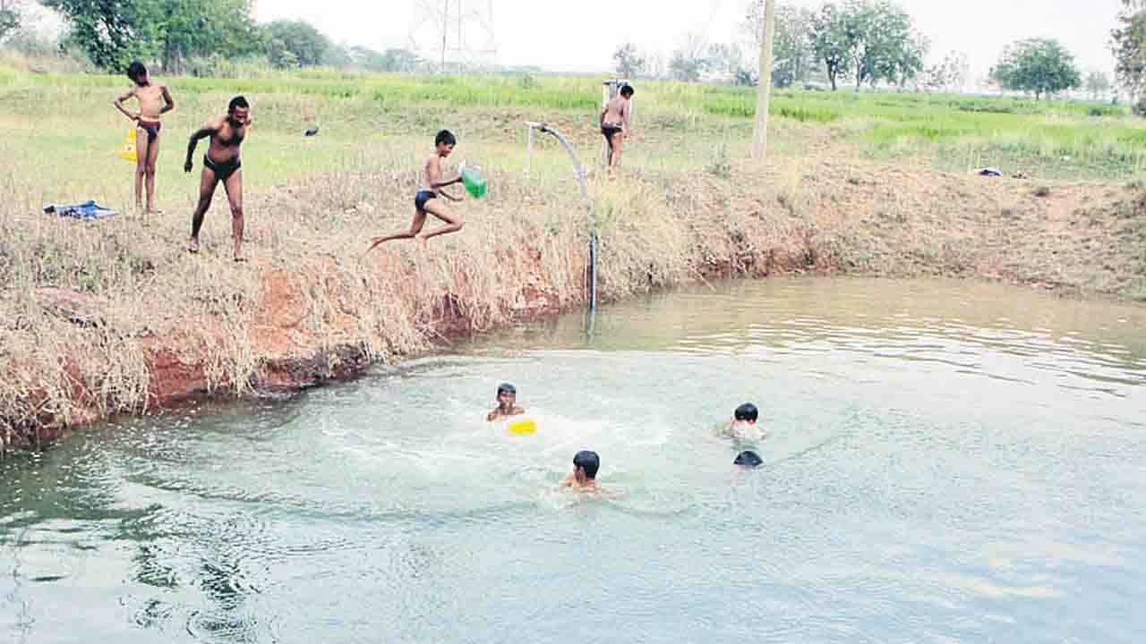 బావుల్లో ఈతలు.. చెరువుల్లో చేపల వేట.. నోరూరించే తాటి ముంజలు.. చెరువు గట్ల వద్ద చెంగు చెంగున ఎగిరే మూగ జీవాలు.. ఎండాకాలం వచ్చిందంటే ఇలాంటి అనేక చిత్రాలు మనకు నిత్యం దర్శనమిస్తుంటాయి. పల్లెల్లో క్షణకాలం కనిపించే ఈ దృశ్యాలు అపురూపం, అద్భుతం. ఇవే కాకుండా, తప్పనిసరి పరిస్థితిలో బయటకి వెళ్లేవారు కొందరు గొడుగులతో వెళ్తే.. మరికొందరు తమ చున్నీలు, తువ్వాళలు చుట్టుకుని ఎండ నుంచి రక్షణ పొందుతుంటారు. ఇలాంటి చిత్రాలు గురువారం ఉమ్మడి కరీంనగర్ జిల్లాలోని పలు చోట్ల ‘నమస్తే’ కెమరాకు చిక్కాయి.