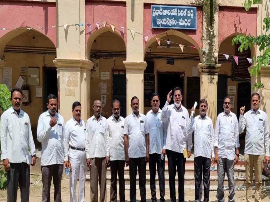 మధిర : కొత్తగూడెంలో సీనియర్ న్యాయవాది జలసూత్రం శివరాంప్రసాద్పై ఆరాచకశక్తులు దాడిని ఖండిస్తూ మధిర బార్ అసోసియేషన్ ఆధ్వర్యంలో సోమవారం మధిర కోర్టులో న్యాయవాదులు విధులు బహిష్కరించి, కోర్టు ముందు నిరసన వ్యక్తం చేశారు. ఇలాంటి దాడులను ప్రతిఒక్కరూ తీవ్రంగా ఖండించాలని న్యాయవాదులు అన్నారు. ఈ కార్యక్రమంలో మధిర బార్అసోసియేషన్ అధ్యక్షుడు భైరవభట్ల శ్రీనివాసరావు, సీనియర్ న్యాయవాదులు వాసంశెట్టి కోటేశ్వరరావు, సీ. గోపాల్, నంబూరి జనార్ధన్రావు, చావలి రామరాజు, టీ.వెంకట్రావు, జే.రమేష్, నెల్లూరి రవి, ఎం.సతీష్, కే.విజయ్కుమార్, బీ.పుల్లారావు, పుట్టా శ్రీనివాసరావు, కోట జ్ఞానేష్ తదితరులు పాల్గొన్నారు.
