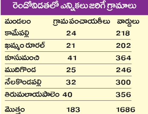 మామిళ్లగూడెం, నవంబర్ 29 : ఖమ్మం జిల్లాలో గ్రామ పంచాయతీ ఎన్నికల్లో భాగంగా రెండో విడతలో నామినేషన్లు స్వీకరించేందుకు అధికారులు అన్ని ఏర్పాట్లు పూర్తిచేశారు. రెండోవిడతలో 6 మండలాల్లోని 183 గ్రామాల్లో సర్పంచ్, ఉప సర్పంచ్, 1,686 వార్డు సభ్యులను ఎన్నుకునేందుకు నామినేషన్ల ప్రక్రియను చేపట్టనున్నారు. ఉదయం10 నుంచి సాయంత్రం 5గంటల వరకు మూడురోజుల పాటు నామినేషన్లను స్వీకరిస్తారు.