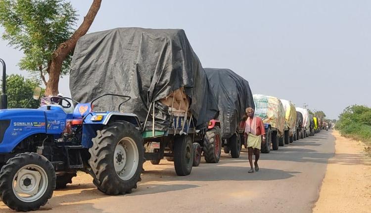 ధన్వాడ, మే 12 : మండల కొనుగోలు కేంద్రానికి రైతులు పెద్ద ఎత్తున ధాన్యాన్ని తీసుకొచ్చారు. బుధవారం పెద్ద ఎత్తున వరి లోడ్ వాహనాలు రావడంతో దారి పొడవునా వాహనాలతో నిండిపోయింది. వివిధ గ్రామాల నుంచి రైతులు ధాన్యాన్ని విక్రయించడానికి తీసుకొచ్చారు. గన్నీ బ్యాగుల కొరత ఉండడంతో రైతులు ధాన్యాన్ని నిన్నటి వరకు పొలాల వద్దనే ఉంచుకున్నారు. సోమవారం రెండు లారీల నుంచి గన్నీ బ్యా గులు రావడంతో ధాన్యాన్ని నింపుకొని కొనుగోలు కేంద్రానికి తీసుకొచ్చారు. దీంతో ధాన్యం వాహనాలతో రహదారి నిండిపోయింది. కిష్టాపూర్లో మార్కె ట్ గోదాము వద్ద వడ్ల తూకం ఏర్పాటు చేశారు. ధాన్యం కొనుగోలు కోసం వా హనాలు క్యూలో ఉన్నప్పటికీ చాలా మంది రైతులకు ఇంకా బ్యాగుల కొరత ఉండడంతో ధాన్యం కల్లాల వద్దనే ఉంచుకున్నారు. మండలంలోని కిష్టాపూర్, రాంకిష్టయ్యపల్లి, గున్ముక్ల, మందిపల్లి గ్రామాలకు గన్నీ బ్యాగులను పూర్తి స్థాయి లో అందలేదని, ఇంకా లక్ష అవసరమని చైర్మన్ వెంకట్రామ్రెడ్డి తెలిపారు. ఇప్పటి వరకు లక్ష బస్తాల ధాన్యాన్ని కొనుగోలు చేశామన్నారు.