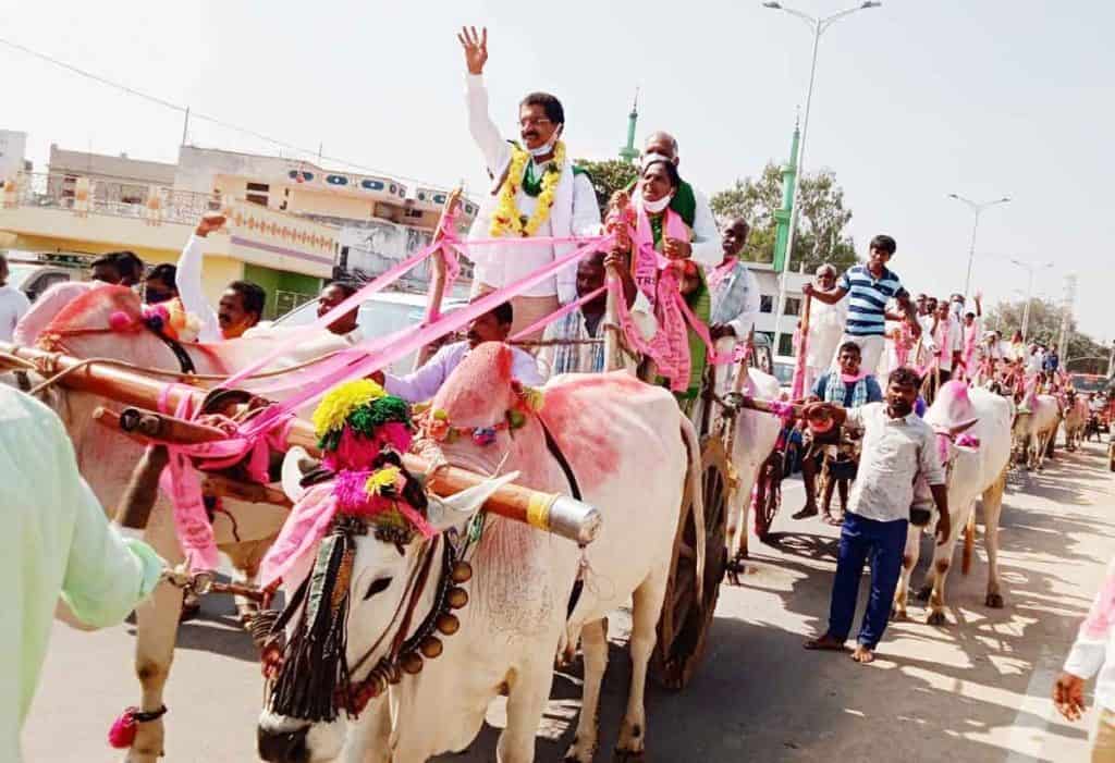 ‘బండెనక బండికట్టి.. పదహారు బండ్లు కట్టి’.. అనే సినీ గీతాన్ని తలపించేలా ఎడ్ల బండిపై ఎమ్మెల్యే రాజేందర్రెడ్డి వచ్చారు. మండల కేంద్రంలో రైతు వేదిక భవనాన్ని ప్రారంభించేందుకు వచ్చిన ఎమ్మెల్యే మండల కేంద్రంలోని తెలంగాణ చౌరస్తా నుంచి రైతు వేదిక వరకు ఎడ్ల బండిపై వచ్చారు. తనకు రైతులపై ఉన్న చిత్తశుద్ధిని చాటారు.