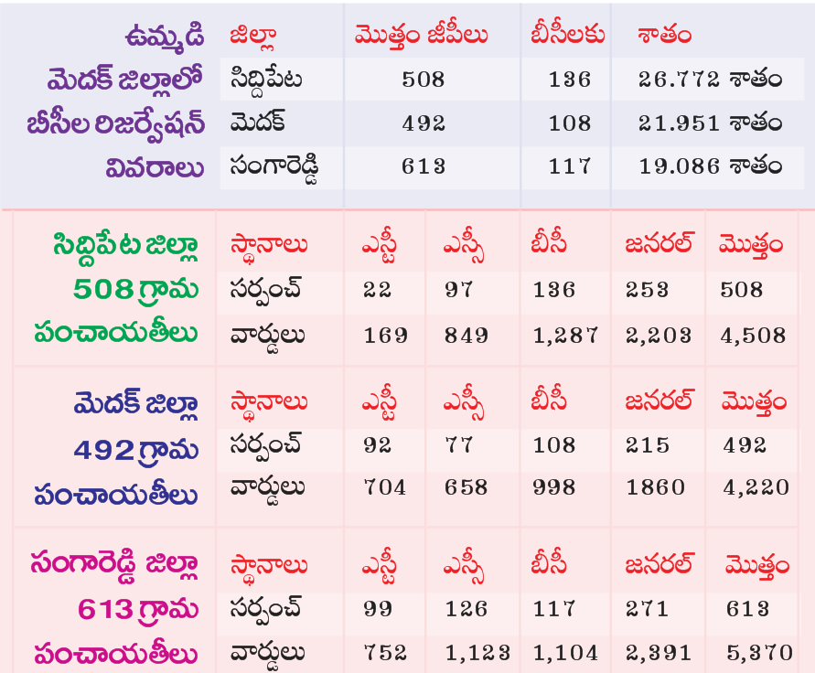 దీని ప్రకారం ఎక్కడా రొటేషన్ పద్ధ్దతిలో రిజర్వేషన్లు జరగలేదని బీసీలు మండిపడుతున్నారు. తాజాగా ప్రకటించిన రిజర్వేషన్లు చూసుకుంటే సిద్దిపేట జిల్లాలో 508 గ్రామ పంచాయతీలు ఉండగా, ఇందులో 136 గ్రామాలకు మాత్రమే బీసీలకు కేటాయించారు. అంటే కేవలం 26.772 శాతం స్థానాలు కేటాయించారు. మెదక్ జిల్లాలో 492 గ్రామ పంచాయతీలు ఉండగా, బీసీలకు 108 గ్రామ పంచాయతీలు కేటాయించారు. ఇక్కడ 21.951 శాతం వచ్చింది. సంగారెడ్డి జిల్లాలో 613 గ్రామ పంచాయతీలు ఉండగా, 117 గ్రామ పంచాయతీలను బీసీలకు కేటాయించారు. ఇక్కడ బీసీలకు 19.086 శాతం రిజర్వేషన్ మాత్రమే దక్కింది. మొత్తంగా ఉమ్మడి మెదక్ జిల్లాలో బీసీలకు తీరని అన్యాయాన్ని కాంగ్రెస్ ప్రభుత్వం చేసింది. కాంగ్రెస్ పార్టీ బీసీలకు దోకా చేసింది. అని మండిపడుతున్నారు.
