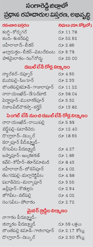 టీఆర్ఎస్ ప్రభుత్వం మండల కేంద్రాల నుంచి జిల్లా కేంద్రమైన సంగారెడ్డికి 66.85 కోట్లతో రహదారుల విస్తరణ, మరమ్మతులు చేపట్టింది. సింగిల్ రోడ్లను డబుల్ లేన్గా అభివృద్ధి చేసింది. రూ.76.45 కోట్లతో ప్రభుత్వం డబుల్ లేన్ రోడ్ల నిర్మాణం చేపట్టింది. రూ.69.24 కోట్లతో 42 అవసరమైన చోట హైలెవల్ బ్రిడ్జిల నిర్మాణం చేపట్టింది.