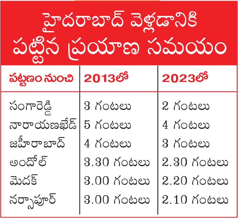 సంగారెడ్డి జిల్లాకు కూతవేటు దూరంలో ఉన్న కంది-శంకర్పల్లి రోడ్డు తెలంగాణ రాష్ట్రం వచ్చాక ఫోర్లైన్గా మారింది. గతంలో సింగిల్ రోడ్డు, అడుగడుగునా గుంతలతో ప్రయాణం గంటకు పైగానే సమయం పట్టేది. ప్రస్తుతం 35 నిమిషాల్లో ప్రయాణం ముగుస్తున్నది. ఈ రోడ్డుపై గతంలో 40కి మించి వేగంగా వెళ్తే, ఇప్పుడు 80 నుంచి 100 కిలోమీటర్ల స్పీడ్తో వాహనాలు రాకపోకలు సాగిస్తున్నాయి.