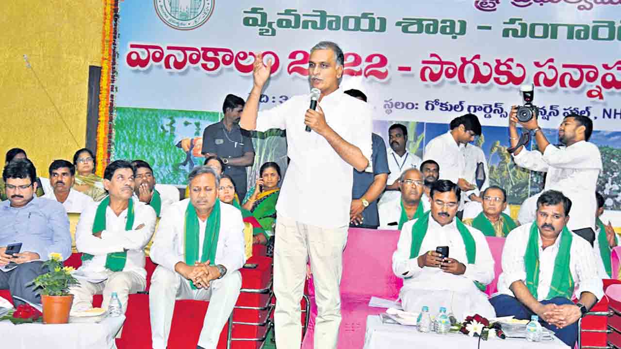 రైతులు వరి స్థానంలో ఇతర పంటల సాగుపై దృష్టి సారించాలని, సంగారెడ్డి జిల్లా నేలలు సాగుకు ఎంతో అనుకూలమైనవని రాష్ట్ర ఆర్థిక, వైద్యారోగ్యశాఖల మంత్రి హరీశ్రావు అన్నారు. మంగళవారం కొండాపూర్ మండల కేంద్రంలో వ్యవసాయశాఖ ఆధ్వర్యంలో ఏర్పాటు చేసిన వానకాలం సాగు సన్నాహక సమావేశానికి వ్యవసాయ శాఖ మంత్రి నిరంజన్రెడ్డితో కలిసిన ఆయన ముఖ్య అతిథిగా హాజరయ్యారు. ఈ సందర్భంగా మాట్లాడుతూ పచ్చిరొట్ట ఎరువులతో అధిక దిగుబడులు సాధించవచ్చన్నారు.