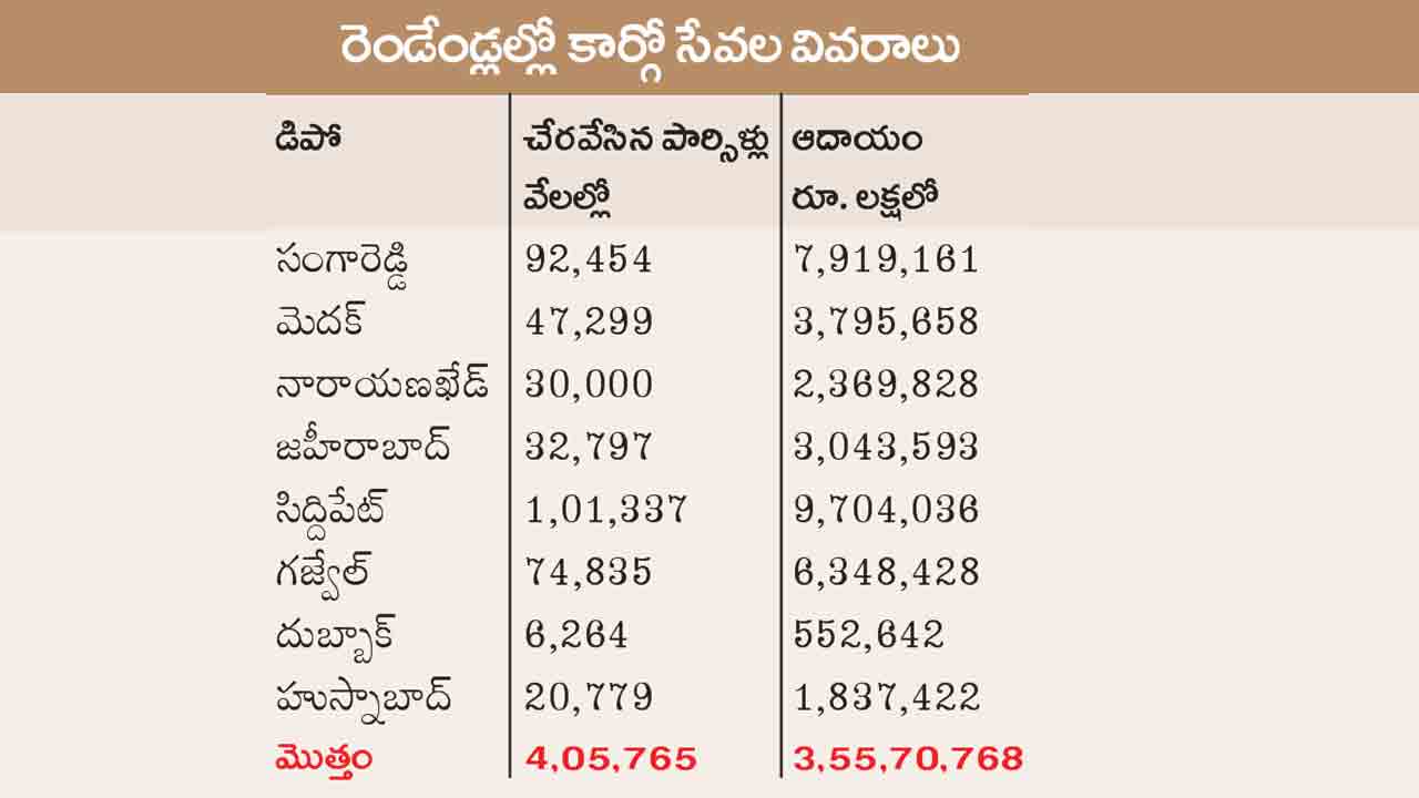 కార్గో సేవలను ఆర్టీసీ కరోనా కష్ట కాలంలో జూన్ 19న 2020లో రాష్ట్ర వ్యాప్తంగా ప్రారంభించింది. అప్పటి నుంచి రవాణా సేవలు నిరాటకంగా కొనసాగిస్తూ పార్సిల్స్ సేవల్లో తనదైన ముద్ర వేసుకున్నది. ప్రైవేటు పార్సిల్ సర్వీసులకు దీటుగా సేవలు విస్తృతం చేసి సరుకుల రవాణాలో ముందువరుసలో నిలబడింది. ఇందుకోసం ఆర్టీసీ యాజమాన్యం, అధికారులు, కార్మికులు సమయస్ఫూర్తితో వ్యవహరిస్తూ ఆదాయం పెంచుకునేందుకు చర్యలు చేపట్టారు. కేవలం రెండేండ్లల్లోనే మెదక్ రీజియన్ పరిధిలో 18 పాయింట్లను ఏర్పాటు చేసి 4,05,765 పార్సిళ్లను చేరవేసింది. కార్గో పాయింట్లలో బుకింగ్ చేసుకుని ఇంటింటికీ సరఫరా చేస్తున్నది. ఆర్టీసీ అందించిన సేవలకు రూ.3,55,70,768 కోట్ల ఆదాయం సమకూర్చికోవడం సంతోషకరం. ప్రస్తుతం కార్గోతో పార్సిళ్లను వినియోగదారులు ఇచ్చిన అడ్రస్లకు చేరవేస్తే వచ్చే ఆదాయంతో వేతనాల చింతలేదనే కార్మికులు ఆనందం వ్యక్తం చేస్తున్నారు.